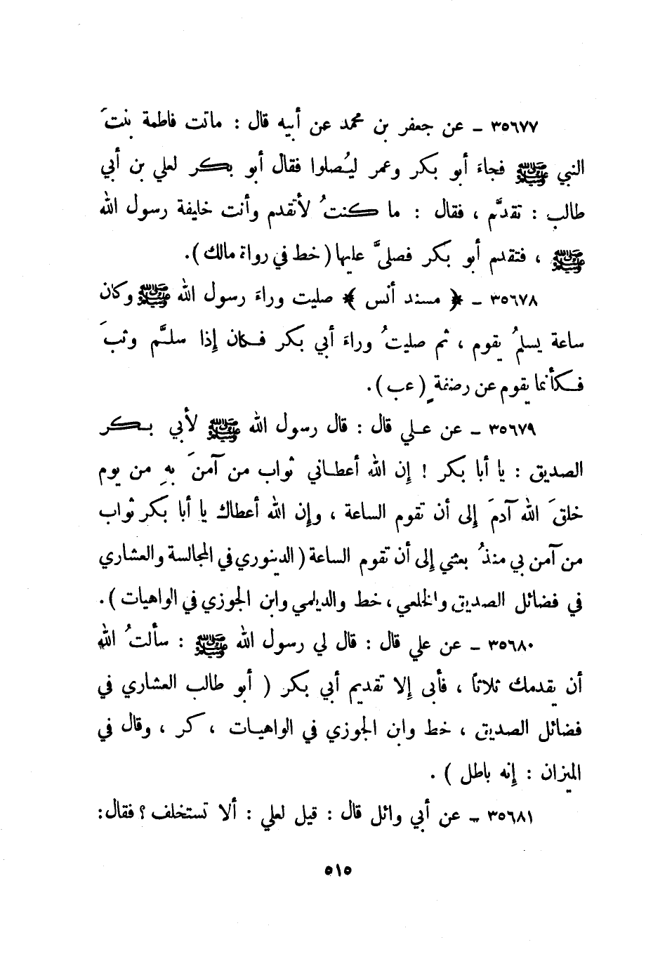 35677- عن جعفر بن محمد عن أبيه قال: ماتت فاطمة بنت النبي صلى الله عليه وسلم فجاء أبو بكر وعمر ليصلوا فقال أبو بكر لعلي بن أبي طالب: تقدم، فقال: ما كنت لأتقدم وأنت خليفة رسول الله صلى الله عليه وسلم، فتقدم أبو بكر فصلى عليها. "خط في رواة مالك".