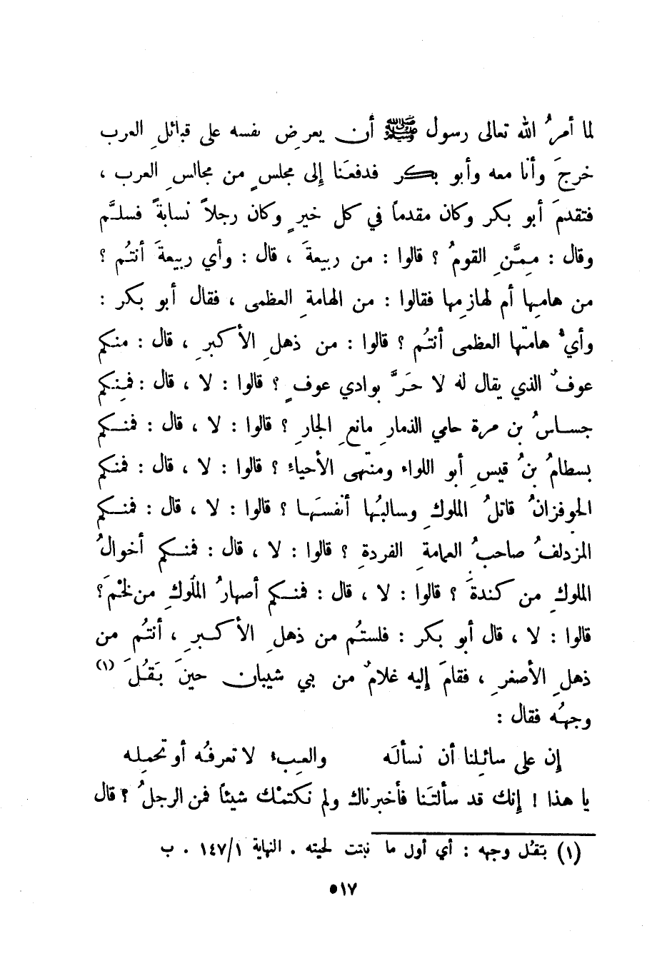 لما أمر الله تعالى رسول الله صلى الله عليه وسلم أن يعرض نفسه على قبائل العرب خرج وأنا معه وأبو بكر فدفعنا إلى مجلس من مجالس العرب، فتقدم أبو بكر وكان مقدما في كل خير وكان رجلا نسابة فسلم وقال: ممن القوم؟ قالوا: من ربيعة، قال: وأي ربيعة أنتم؟ من هامها أم لهازمها فقالوا: من الهامة العظمى، فقال أبو بكر: وأي هامتها العظمى أنتم؟ قالوا: من ذهل الأكبر، قال: منكم عوف الذي يقال له لا حر بوادي عوف؟ قالوا: لا، قال: فمنكم جساس بن مرة حامي الذمار مانع الجار؟ قالوا: لا، قال: فمنكم بسطام بن قيس أبو اللواء ومنتهى الأحياء؟ قالوا: لا، قال: فمنكم الحوفزان قاتل الملوك وسالبها أنفسها؟ قالوا: لا، قال: فمنكم المزدلف صاحب العمامة الفردة؟ قالوا: لا، قال: فمنكم أخوال الملوك من كندة؟ قالوا: لا، قال: فمنكم أصهار الملوك من لخم؟ قالوا: لا، قال أبو بكر: فلستم من ذهل الأكبر، أنتم من ذهل الأصغر، فقام إليه غلام من بني شيبان حين بقل 1 وجهه فقال: