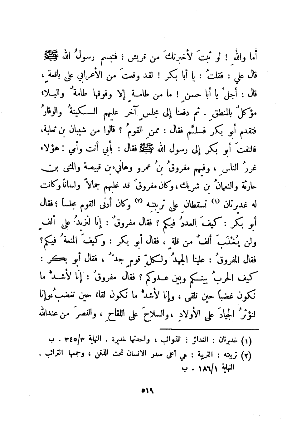 أما والله! لو ثبت لأخبرتك من قريش؛ فتبسم رسول الله صلى الله عليه وسلم قال علي: فقلت: يا أبا بكر! لقد وقعت من الأعرابي على باقعة، قال: أجل يا أبا حسن! ما من طامة إلا وفوقها طامة والبلاء مؤكل بالمنطق. ثم دفعنا إلى مجلس آخر عليهم السكينة والوقار فتقدم أبو بكر فسلم فقال: ممن القوم؟ قالوا من شيبان بن ثعلبة، فالتفت أبو بكر إلى رسول الله صلى الله عليه وسلم فقال: بأبي أنت وأمي! هؤلاء غرر الناس، وفيهم مفروق بن عمرو وهانيء بن قبيصة والمثنى بن حارثة والنعمان بن شريك، وكان مفروق قد غلبهم جمالا ولسانا وكانت له غديرتان 1 تسقطان على تريبته 2 وكان أدنى القوم مجلسا؛ فقال أبو بكر: كيف العدد فيكم؟ فقال مفروق: إنا لنزيد على ألف ولن يغلب ألف من قلة، فقال أبو بكر: وكيف المنعة فيكم؟ فقال المفروق: علينا الجهد ولكل قوم جد، فقال أبو بكر: كيف الحرب بينكم وبين عدوكم؟ فقال مفروق: إنا لأشد ما نكون غضبا حين نلقى، وإنا لأشد ما نكون لقاء حين نغضب، وإنا لنؤثر الجياد على الأولاد، والسلاح على اللقاح، والنصر من عند الله