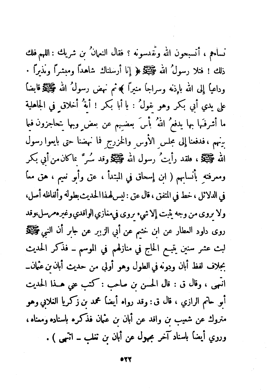 نساءهم، أتسبحون الله وتقدسونه؟ فقال النعمان بن شريك: اللهم فلك ذلك! فتلا رسول الله صلى الله عليه وسلم {إِنَّا أَرْسَلْنَاكَ شَاهِداً وَمُبَشِّراً وَنَذِيراً وَدَاعِياً إِلَى اللَّهِ بِإِذْنِهِ وَسِرَاجاً مُنِيراً} ثم نهض رسول الله صلى الله عليه وسلم قابضا على يدي أبي بكر وهو يقول: يا أبا بكر! أية أخلاق في الجاهلية ما أشرفها بها يدفع الله بأس بعضهم عن بعض وبها يتحاجزون فيما بينهم، فدفعنا إلى مجلس الأوس والخزرج فما نهضنا حتى بايعوا رسول الله صلى الله عليه وسلم، فلقد رأيت رسول الله صلى الله عليه وسلم وقد سر بما كان من أبي بكر ومعرفته بأنسابهم. "ابن إسحاق في المبتدأ، عق وأبو نعيم، هق معا في الدلائل، خط في المتفق، قال عق: ليس لهذا الحديث بطوله وألفاظه أصل، ولا يروى من وجه يثبت إلا شيء يروى في مغازي الواقدي وغيره مرسل، وقد روى داود العطار عن ابن خثيم عن أبي الزبير عن جابر أن النبي صلى الله عليه وسلم لبث عشر سنين يتبع الحاج في منازلهم في الموسم - فذكر الحديث بجلاف لفظ أبان ودونه في الطول وهو أولى من حديث أبان بن عثمان - انتهى، وقال ق: قال الحسن بن صاحب: كتب عني هذا الحديث أبو حاتم الرازي، قال ق: وقد رواه أيضا محمد بن زكريا الغلابي وهو متروك عن شعيب بن واقد عن أبان بن عثمان فذكره بإسناده ومعناه، وروي أيضا بإسناد آخر مجهول عن أبان بن تغلب - انتهى".