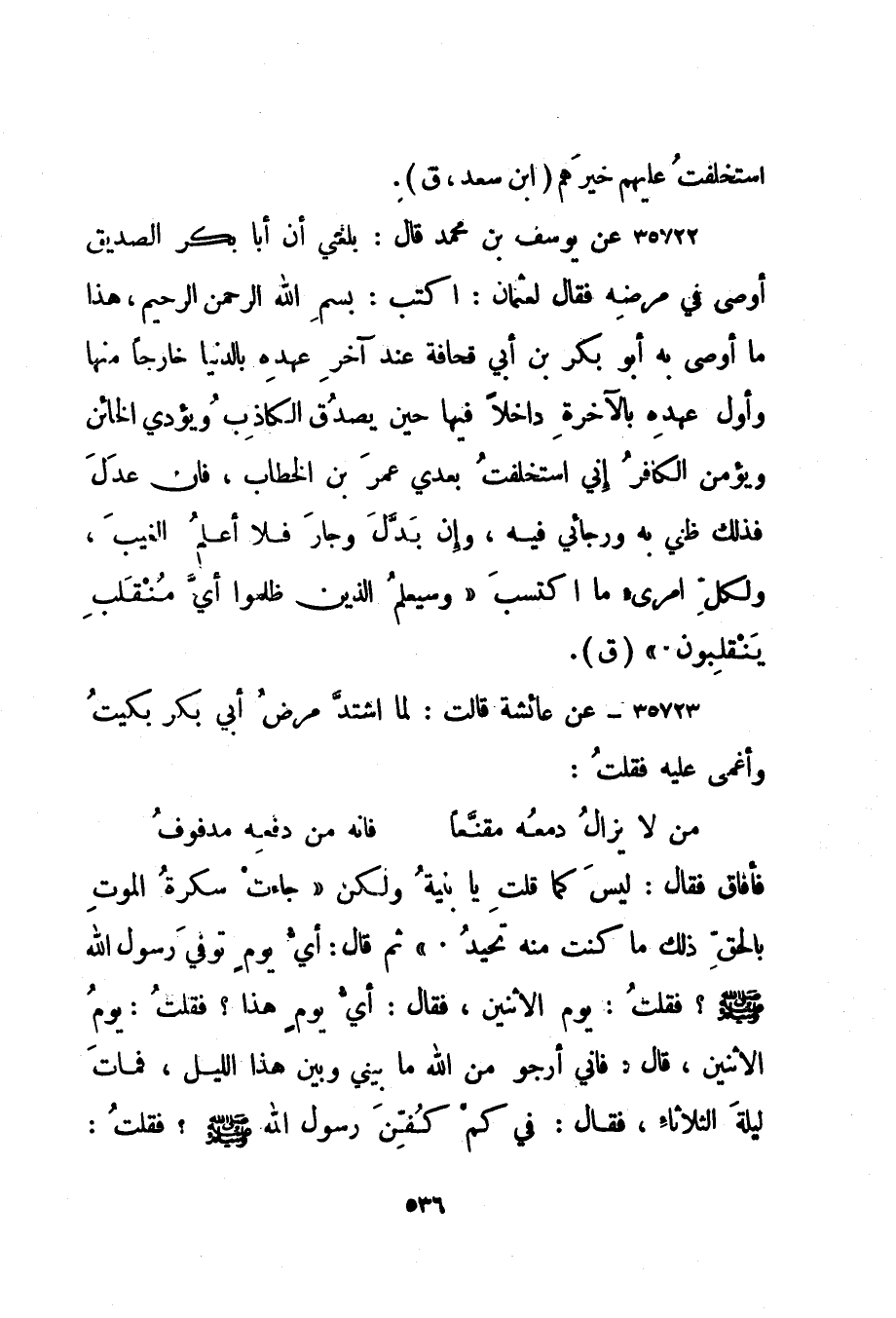 35722- عن يوسف بن محمد قال: بلغني أن أبا بكر الصديق أوصى في مرضه فقال لعثمان: اكتب: بسم الله الرحمن الرحيم، هذا ما أوصى به أبو بكر بن أبي قحافة عند آخر عهده بالدنيا خارجا منها وأول عهده بالآخرة داخلا فيها حين يصدق الكاذب ويؤدي الخائن ويؤمن الكافر إني استخلفت بعدي عمر بن الخطاب، فإن عدل فذلك ظني به ورجائي فيه، وإن بدل وجار فلا أعلم الغيب، ولكل امرئ ما اكتسب {وَسَيَعْلَمُ الَّذِينَ ظَلَمُوا أَيَّ مُنْقَلَبٍ يَنْقَلِبُونَ} . "ق".