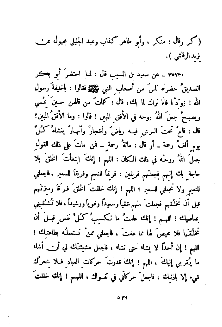 35730- عن سعيد بن المسيب قال: لما احتضر أبو بكر الصديق حضره ناس من أصحاب النبي صلى الله عليه وسلم فقالوا: يا خليفة رسول الله! زودنا فإنا نراك لما بك، قال: كلمات من قالهن حين يمسي ويصبح جعل الله روحه في الأفق المبين! قالوا: وما الأفق المبين؟ قال: قاع تحت العرش فيه رياض وأشجار وأنهار يغشاه كل يوم ألف رحمة - أو قال: مائة رحمة - فمن مات على ذلك القول جعل الله روحه في ذلك المكان: اللهم! إنك ابتدأت الخلق بلا حاجة بك إليهم فجعلتهم فريقين: فريقا للنعيم وفريقا للسعير، فاجعلني للنعيم ولا تجعلني للسعير؛ اللهم! إنك خلقت الخلق فرقا وميزتهم قبل أن تخلقهم فجعلت منهم شقيا وسعيدا وغويا ورشيدا، فلا تشقيني بمعاصيك؛ اللهم! إنك علمت ما تكسب كل نفس قبل أن تخلقها فلا محيص لها مما علمت، فاجعلني ممن تستعمله بطاعتك؛ اللهم! إن أحدا لا يشاء حتى تشاء، فاجعل مشيئتك لي أن أشاء ما يقربني إليك، اللهم! إنك قدرت حركات العباد فلا يتحرك شيء إلا بإذنك، فاجعل حركاتي في تقواك، اللهم! إنك خلقت