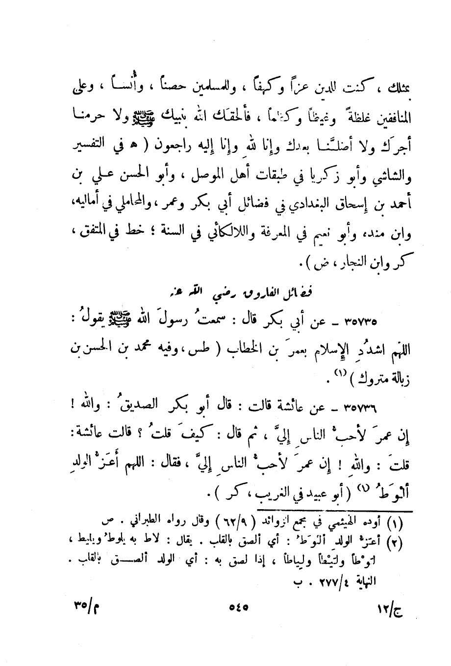 35735- عن أبي بكر قال: سمعت رسول الله صلى الله عليه وسلم يقول: "اللهم اشدد الإسلام بعمر بن الخطاب". "طس، وفيه محمد بن الحسن بن زبالة متروك". 1