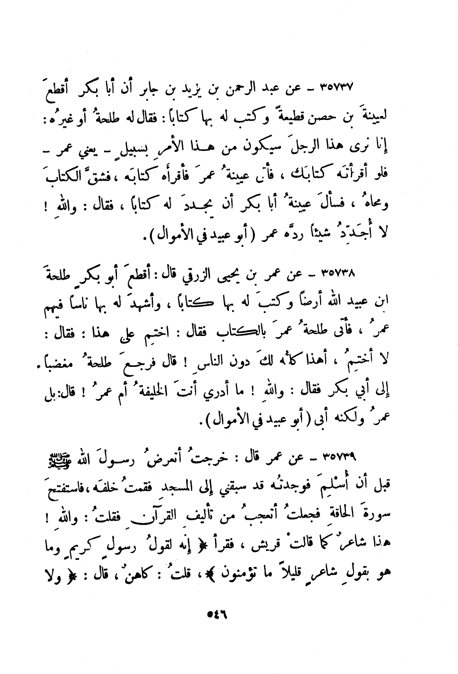 35738- عن عمر بن يحيى الزرقي قال: أقطع أبو بكر طلحة ابن عبيد الله أرضا وكتب له بها كتابا، وأشهد له بها ناسا فيهم عمر، فأتى طلحة عمر بالكتاب فقال: اختم على هذا: فقال: لا أختم، أهذا كله لك دون الناس! قال فرجع طلحة مغضبا إلى أبي بكر فقال: والله! ما أدري أنت الخليفة أم عمر! قال: بل عمر ولكنه أبى. "أبو عبيد في الأموال".