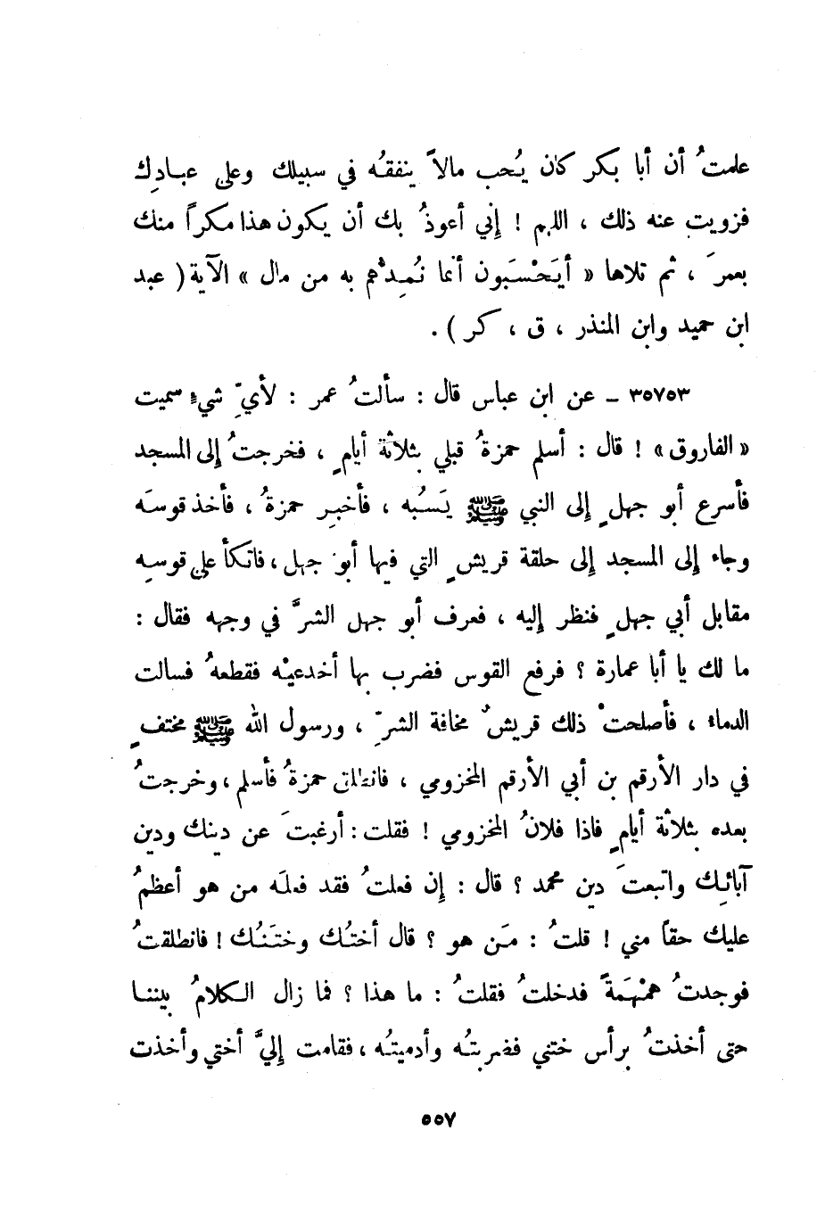 35753- عن ابن عباس قال: سألت عمر: لأي شيء سميت "الفاروق"! قال: أسلم حمزة قبلي بثلاثة أيام، فخرجت إلى المسجد فأسرع أبو جهل إلى النبي صلى الله عليه وسلم يسبه، فأخبر حمزة، فأخذ قوسه وجاء إلى المسجد إلى حلقة قريش التي فيها أبو جهل، فاتكأ على قوسه مقابل أبي جهل فنظر إليه، فعرف أبو جهل الشر في وجهه فقال: مالك يا أبا عمارة؟ فرفع القوس فضرب بها أخدعيه فقطعه فسألت الدماء، فأصلحت ذلك قريش مخافة الشر، ورسول الله صلى الله عليه وسلم مختف في دار الأرقم بن أبي الأرقم المخزومي، فانطلق حمزة فأسلم، وخرجت بعده بثلاثة أيام فإذا فلان المخزومي! فقلت: أرغبت عن دينك ودين آبائك واتبعت دين محمد؟ قال: إن فعلت فقد فعله من هو أعظم عليك حقا مني! قلت: من هو؟ قال أختك وختنك! فانطلقت فوجدت همهمة فدخلت فقلت: ما هذا؟ فما زال الكلام بيننا حتى أخذت برأس ختني فضربته وأدميته، فقامت إلي أختي وأخذت