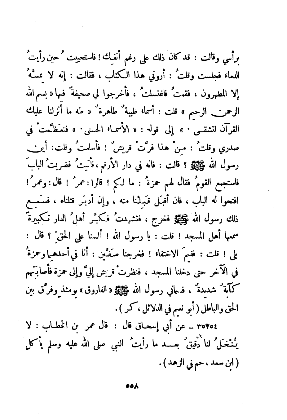 برأسي وقالت: قد كان ذلك على رغم أنفك! فاستحييت حين رأيت الدماء فجلست وقلت: أروني هذا الكتاب، فقالت: إنه لا يمسه إلا المطهرون، فقمت فاغتسلت، فأخرجوا لي صحيفة فيها "بسم الله الرحمن الرحيم" قلت: أسماء طيبة طاهرة {طه مَا أَنْزَلْنَا عَلَيْكَ الْقُرْآنَ لِتَشْقَى} إلى قوله: {الْأَسْمَاءُ الْحُسْنَى} فتعظمت في صدري وقلت: من هذا فرت قريش! فأسلمت وقلت: أين رسول الله صلى الله عليه وسلم؟ قالت: فإنه في دار الأرقم، فأتيت فضربت الباب فاستجمع القوم فقال لهم حمزة: ما لكم؟ قالوا: عمر! قال: وعمر! افتحوا له الباب، فإن أقبل قبلنا منه، وإن أدبر قتلناه، فسمع ذلك رسول الله صلى الله عليه وسلم فخرج، فتشهدت فكبر أهل الدار تكبيرة سمعها أهل المسجد! قلت: يا رسول الله! ألسنا على الحق؟ قال: بلى! قلت: ففيم الاختفاء! فخرجنا صفين: أنا في أحدهما وحمزة في الآخر حتى دخلنا المسجد، فنظرت قريش إلي وإلى حمزة فأصابتهم كآبة شديدة، فسماني رسول الله صلى الله عليه وسلم "الفاروق" يومئذ وفرق بين الحق والباطل. "أبو نعيم في الدلائل، كر".
