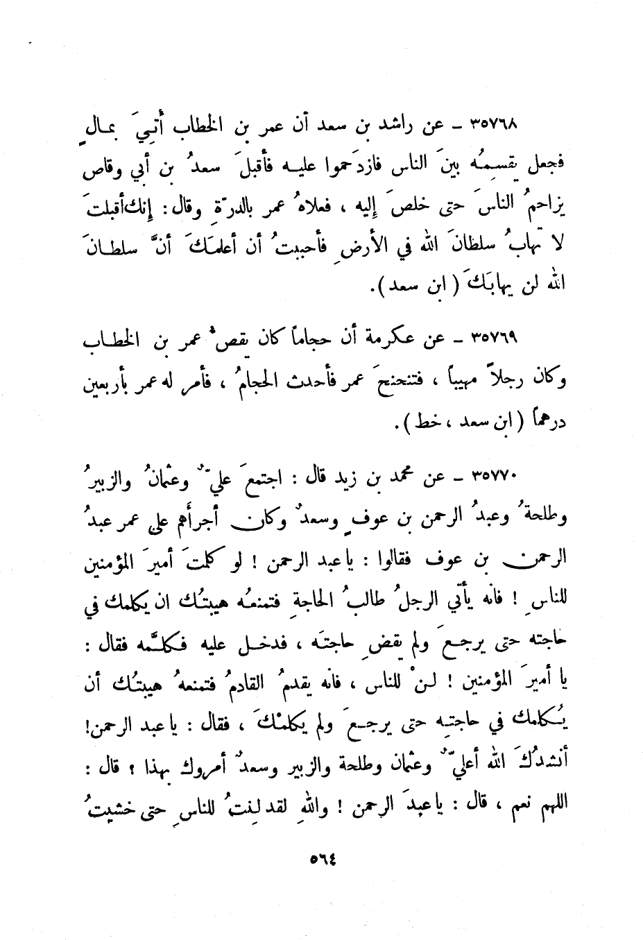 35770- عن محمد بن زيد قال: اجتمع علي وعثمان والزبير وطلحة وعبد الرحمن بن عوف وسعد وكان أجرأهم على عمر عبد الرحمن بن عوف فقالوا: يا عبد الرحمن! لو كلمت أمير المؤمنين للناس! فإنه يأتي الرجل طالب الحاجة فتمنعه هيبتك أن يكلمك في حاجته حتى يرجع ولم يقض حاجته، فدخل عليه فكلمه فقال: يا أمير المؤمنين! لن للناس، فإنه يقدم القادم فتمنعه هيبتك أن يكلمك في حاجته حتى يرجع ولم يكلمك، فقال: يا عبد الرحمن! أنشدك الله أعلي وعثمان وطلحة والزبير وسعد أمروك بهذا؟ قال: اللهم نعم، قال: يا عبد الرحمن! والله لقد لنت للناس حتى خشيت