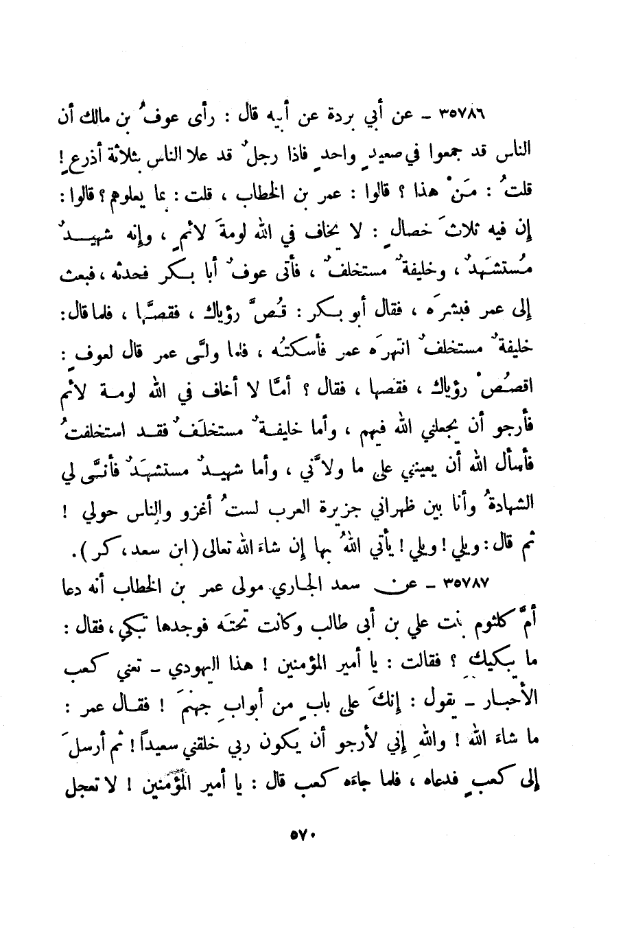 35787- عن سعد الجاري مولى عمر بن الخطاب أنه دعا أم كلثوم بنت علي بن أبي طالب وكانت تحته فوجدها تبكي، فقال: ما يبكيك؟ فقالت: يا أمير المؤمنين! هذا اليهودي - تعني كعب الأحبار - يقول: إنك على باب من أبواب جهنم! فقال عمر: ما شاء الله! والله إني لأرجو أن يكون ربي خلقني سعيدا! ثم أرسل إلى كعب فدعاه، فلما جاءه كعب قال: يا أمير المؤمنين! لا تعجل
