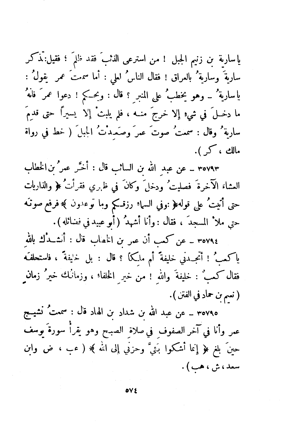 يا سارية بن زنيم الجبل! من استرعى الذئب فقد ظلم؛ فقيل: تذكر سارية وسارية بالعراق! فقال الناس لعلي: أما سمعت عمر يقول: يا سارية - وهو يخطب على المنبر؟ قال: ويحكم! دعوا عمر فإنه ما دخل في شيء إلا خرج منه، فلم يلبث إلا يسيرا حتى قدم سارية وقال: سمعت صوت عمر وصعدت الجبل. "خط في رواة مالك، كر".
