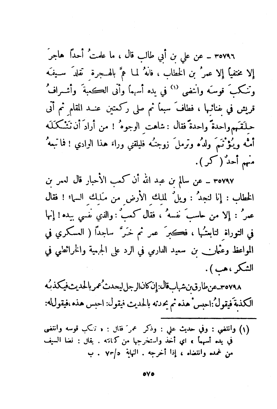 35796- عن علي بن أبي طالب قال، ما علمت أحدا هاجر إلا مختفيا إلا عمر بن الخطاب، فإنه لما هم بالهجرة تقلد سيفه وتنكب قوسه وانتضى 1 في يده أسهما وأتى الكعبة وأشراف قريش في بفنائها، فطاف سبعا ثم صلى ركعتين عند المقام ثم أتى حلقهم واحدة واحدة فقال: شاهت الوجوه! من أراد أن تثكله أمه ويؤتم ولده وترمل زوجته فليلقني وراء هذا الوادي! فما تبعه منهم أحد. "كر".