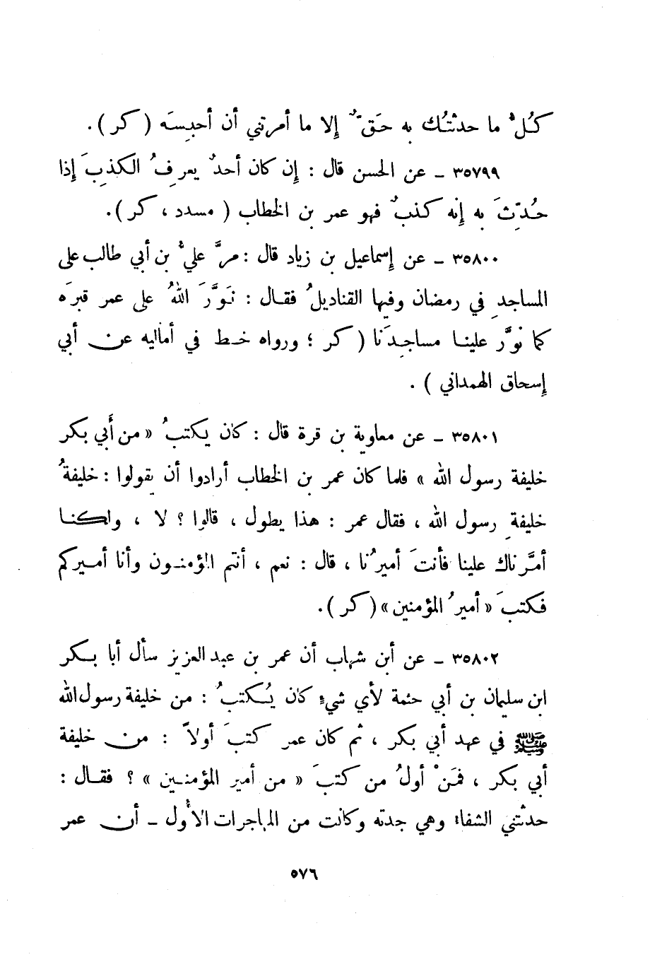 35801- عن معاوية بن قرة قال: كان يكتب "من أبي بكر خليفة رسول الله" فلما كان عمر بن الخطاب أرادوا أن يقولوا: خليفة خليفة رسول الله، فقال عمر: هذا يطول، قالوا؟ لا، ولكنا أمرناك علينا فأنت أميرنا، قال: نعم، أنتم المؤمنون وأنا أميركم فكتب "أمير المؤمنين". "كر".