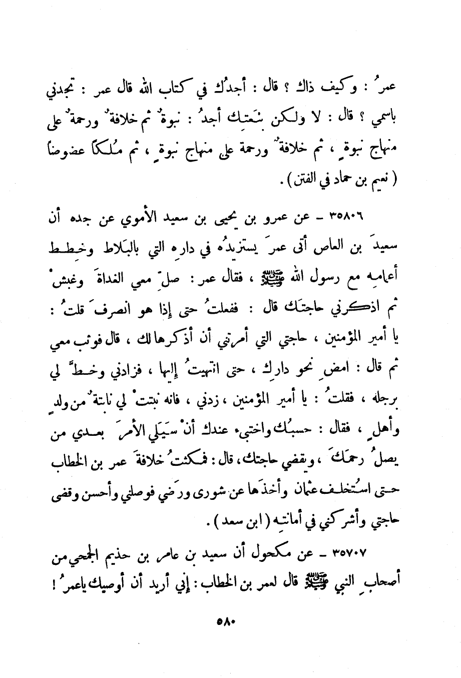 35806- عن عمرو بن يحيى بن سعيد الأموي عن جده أن سعيد بن العاص أتى عمر يستزيده في داره التي بالبلاط وخطط أعمامه مع رسول الله صلى الله عليه وسلم، فقال عمر: صل معي الغداة وغبش ثم اذكرني حاجتك قال: ففعلت حتى إذا هو انصرف قلت: يا أمير المؤمنين، حاجتي التي أمرتني أن أذكرها لك، قال فوثب معي ثم قال: امض نحو دارك، حتى انتهيت إليها، فزادني وخط لي برجله، فقلت: يا أمير المؤمنين، زدني، فإنه نبتت لي نابتة من ولد وأهل، فقال: حسبك واختبئ عندك أن سيلي الأمر بعدي من يصل رحمك، ويقضي حاجتك، قال: فمكثت خلافة عمر بن الخطاب حتى استخلف عثمان وأخذها عن شورى ورضي فوصلني وأحسن وقضى حاجتي وأشركني في أمانته. "ابن سعد".