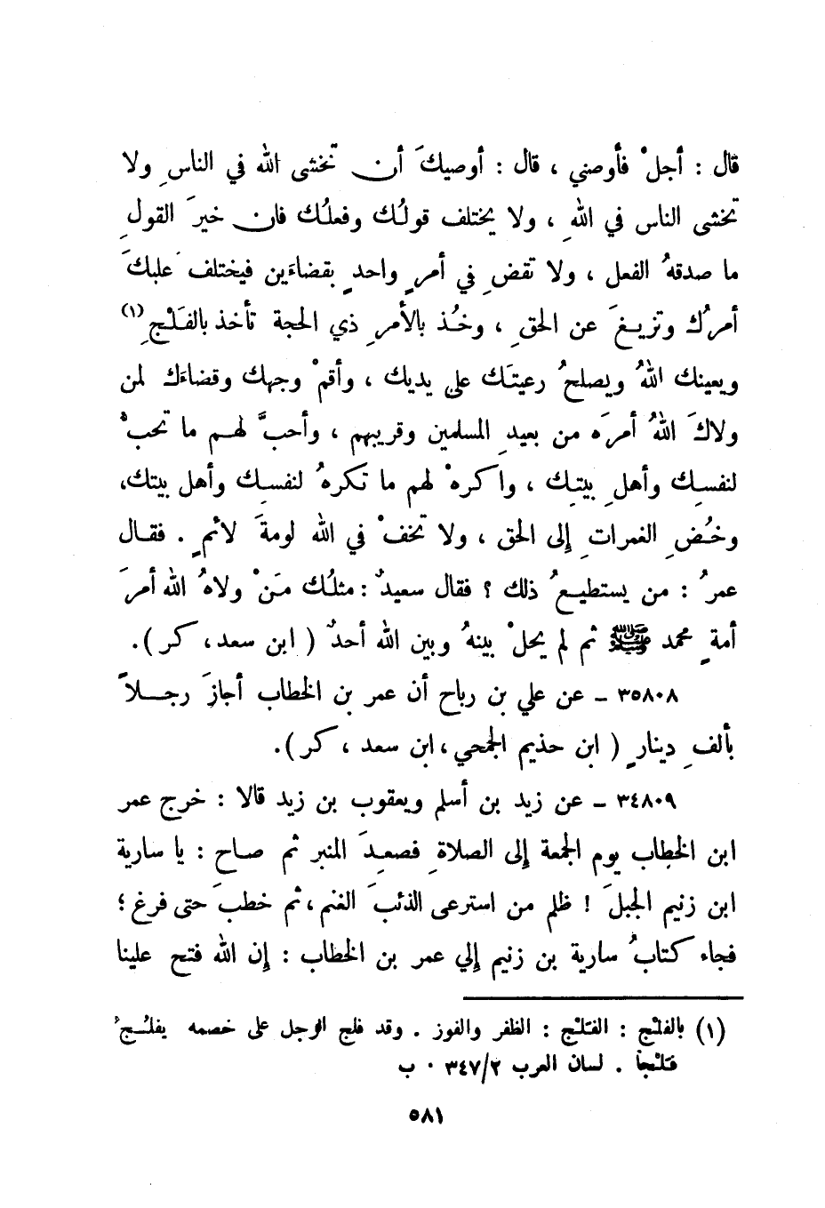 35809- عن زيد بن أسلم ويعقوب بن زيد قالا: خرج عمر ابن الخطاب يوم الجمعة إلى الصلاة فصعد المنبر ثم صاح: يا سارية ابن زنيم الجبل! ظلم من استرعى الذئب الغنم، ثم خطب حتى فرغ؛ فجاء كتاب سارية بن زنيم إلى عمر بن الخطاب: إن الله فتح علينا