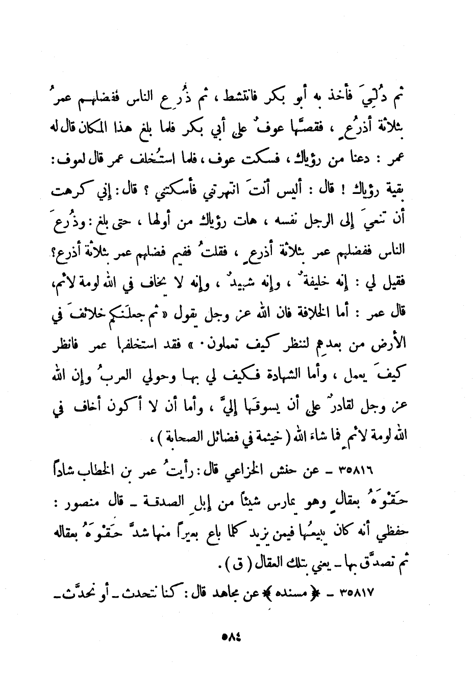 ثم دلي فأخذ به أبو بكر فانتشط، ثم ذرع الناس ففضلهم عمر بثلاثة أذرع، فقصها عوف على أبي بكر فلما بلغ هذا المكان قال له عمر: دعنا من رؤياك، فسكت عوف، فلما استخلف عمر قال لعوف: بقية رؤياك! قال: أليس أنت انتهزتني فأسكتني؟ قال: إني كرهت أن تنعي إلى الرجل نفسه، هات رؤياك من أولها، حتى بلغ: وذرع الناس ففضلهم عمر بثلاثة أذرع، فقلت ففيم فضلهم عمر بثلاثة أذرع؟ فقيل لي: إنه خليفة، وإنه شهيد، وإنه لا يخاف في الله لومة لائم، قال عمر: أما الخلافة فإن الله عز وجل يقول: {ثُمَّ جَعَلْنَاكُمْ خَلائِفَ فِي الْأَرْضِ مِنْ بَعْدِهِمْ لِنَنْظُرَ كَيْفَ تَعْمَلُونَ} . فقد استخلفها عمر فانظر كيف يعمل، وأما الشهادة فكيف لي بها وحولي العرب وإن الله عز وجل لقادر على أن يسوقها إلي، وأما أن لا أكون أخاف في الله لومة لائم فما شاء الله. "خيثمة في فضائل الصحابة".