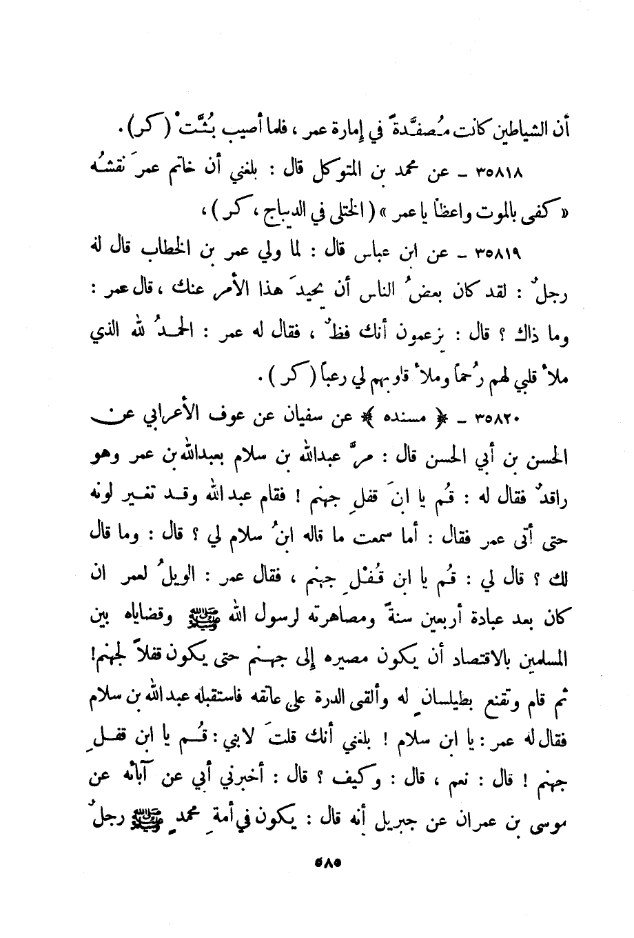 35820- "مسنده" عن سفيان عن عوف الأعرابي عن الحسن بن أبي الحسن قال: مر عبد الله بن سلام بعبد الله بن عمر وهو راقد فقال له: قم يا ابن قفل جهنم! فقام عبد الله وقد تغير لونه حتى أتى عمر فقال: أما سمعت ما قاله ابن سلام لي؟ قال: وما قال لك؟ قال لي: قم يا ابن قفل جهنم، فقال عمر: الويل لعمر إن كان بعد عبادة أربعين سنة ومصاهرته لرسول الله صلى الله عليه وسلم وقضاياه بين المسلمين بالاقتصاد أن يكون مصيره إلى جهنم حتى يكون قفلا لجهنم! ثم قام وتقنع بطيلسان له وألقى الدرة على عاتقه فاستقبله عبد الله بن سلام فقال له عمر: يا ابن سلام! بلغني أنك قلت لابني: قم يا ابن قفل جهنم! قال: نعم، قال: وكيف؟ قال: أخبرني أبي عن آبائه عن موسى بن عمران عن جبريل أنه قال: يكون في أمة محمد صلى الله عليه وسلم رجل