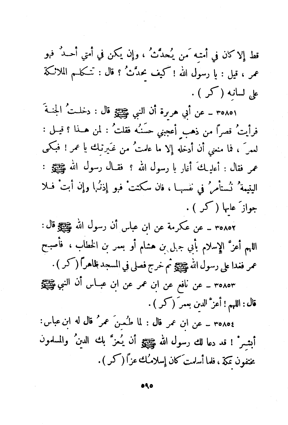 35854- عن ابن عمر قال: لما طعن عمر قال له ابن عباس: أبشر! قد دعا لك رسول الله صلى الله عليه وسلم أن يعز بك الدين والمسلمون مختفون بمكة، فلما أسلمت كان إسلامك عزا. "كر".