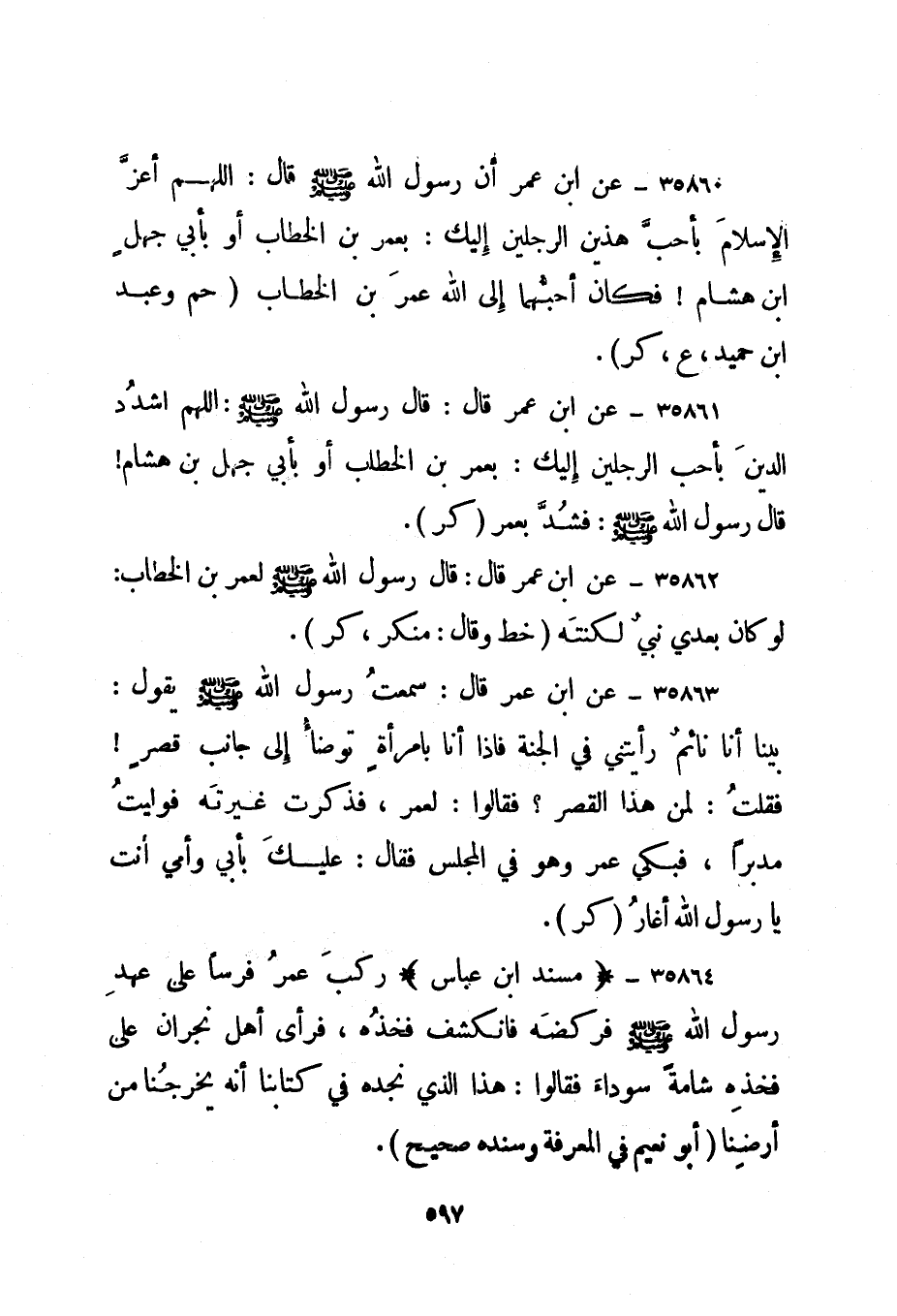35864- "مسند ابن عباس" ركب عمر فرسا على عهد رسول الله صلى الله عليه وسلم فركضه فانكشف فخذه، فرأى أهل نجران على فخذه شامة سوداء فقالوا: هذا الذي نجده في كتابنا أنه يخرجنا من أرضنا. "أبو نعيم في المعرفة وسنده صحيح".
