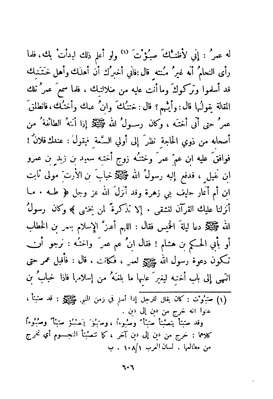 له عمر: إني لأظنك صبؤت 1 ولو أعلم ذلك لبدأت بك، فلما رأى النحام أنه غير منته قال: فإني أخبرك أن أهلك وأهل ختنك قد أسلموا وتركوك وما أنت عليه من ضلالتك، فلما سمع عمر تلك المقالة يقولها قال: وأيهم؟ قال: ختنك وابن عمك وأختك، فانطلق عمر حتى أتى أخته، وكان رسول الله صلى الله عليه وسلم إذا أتته الطائفة من أصحابه من ذوي الحاجة نظر إلى أولي السعة فيقول: عندك فلان! فوافق عليه ابن عم عمر وختنه زوج أخته سعيد بن زيد بن عمرو ابن نفيل، فدفع إليه رسول الله صلى الله عليه وسلم خباب بن الأرت مولى ثابت ابن أم أنمار حليف بني زهرة وقد أنزل الله عز وجل {طه مَا أَنْزَلْنَا عَلَيْكَ الْقُرْآنَ لِتَشْقَى إِلَّا تَذْكِرَةً لِمَنْ يَخْشَى} وكان رسول الله صلى الله عليه وسلم دعا ليلة الخميس فقال: "اللهم أعز الإسلام بعمر بن الخطاب أو بأبي الحكم بن هشام "! فقال ابن عم عمر وأخته: نرجو أن تكون دعوة رسول الله صلى الله عليه وسلم لعمر، فكانت.