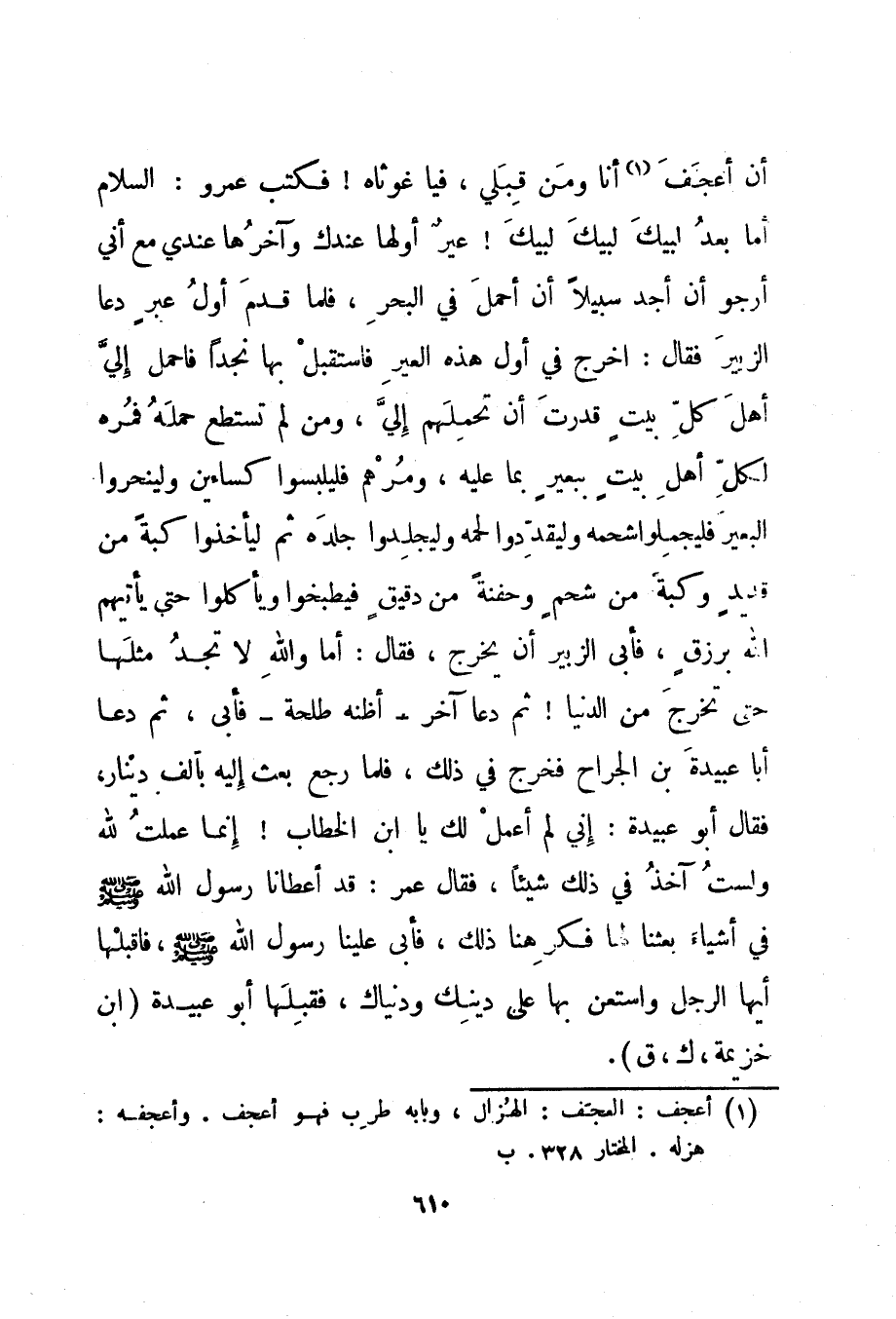 أن أعجف 1 أنا ومن قبلي، فيا غوثاه! فكتب عمرو: السلام أما بعد لبيك لبيك لبيك! عير أولها عندك وآخرها عندي مع أني أرجو أن أجد سبيلا أن أحمل في البحر، فلما قدم أول عير دعا الزبير فقال: اخرج في أول هذه العير فاستقبل بها نجدا فاحمل إلي أهل كل بيت قدرت أن تحملهم إلي، ومن لم تستطع حمله فمره لكل أهل بيت ببعير بما عليه، ومرهم فليلبسوا كساءين ولينحروا البعير فليجملوا شحمه وليقددوا لحمه وليجلدوا جلده ثم ليأخذوا كبة من قديد وكبة من شحم وحفنة من دقيق فيطبخوا ويأكلوا حتى يأتيهم الله برزق، فأبى الزبير أن يخرج، فقال: أما والله لا تجد مثلها حتى تخرج من الدنيا، ثم دعا آخر - أظنه طلحة - فأبى، ثم دعا أبا عبيدة بن الجراح فخرج في ذلك، فلما رجع بعث إليه بألف دينار، فقال أبو عبيدة: إني لم أعمل لك يا ابن الخطاب! إنما عملت لله ولست آخذ في ذلك شيئا، فقال عمر: قد أعطانا رسول الله صلى الله عليه وسلم في أشياء بعثنا لها فكرهنا ذلك، فأبى علينا رسول الله صلى الله عليه وسلم، فاقبلها أيها الرجل واستعن بها على دينك ودنياك، فقبلها أبو عبيدة. "ابن خزيمة، ك، ق".