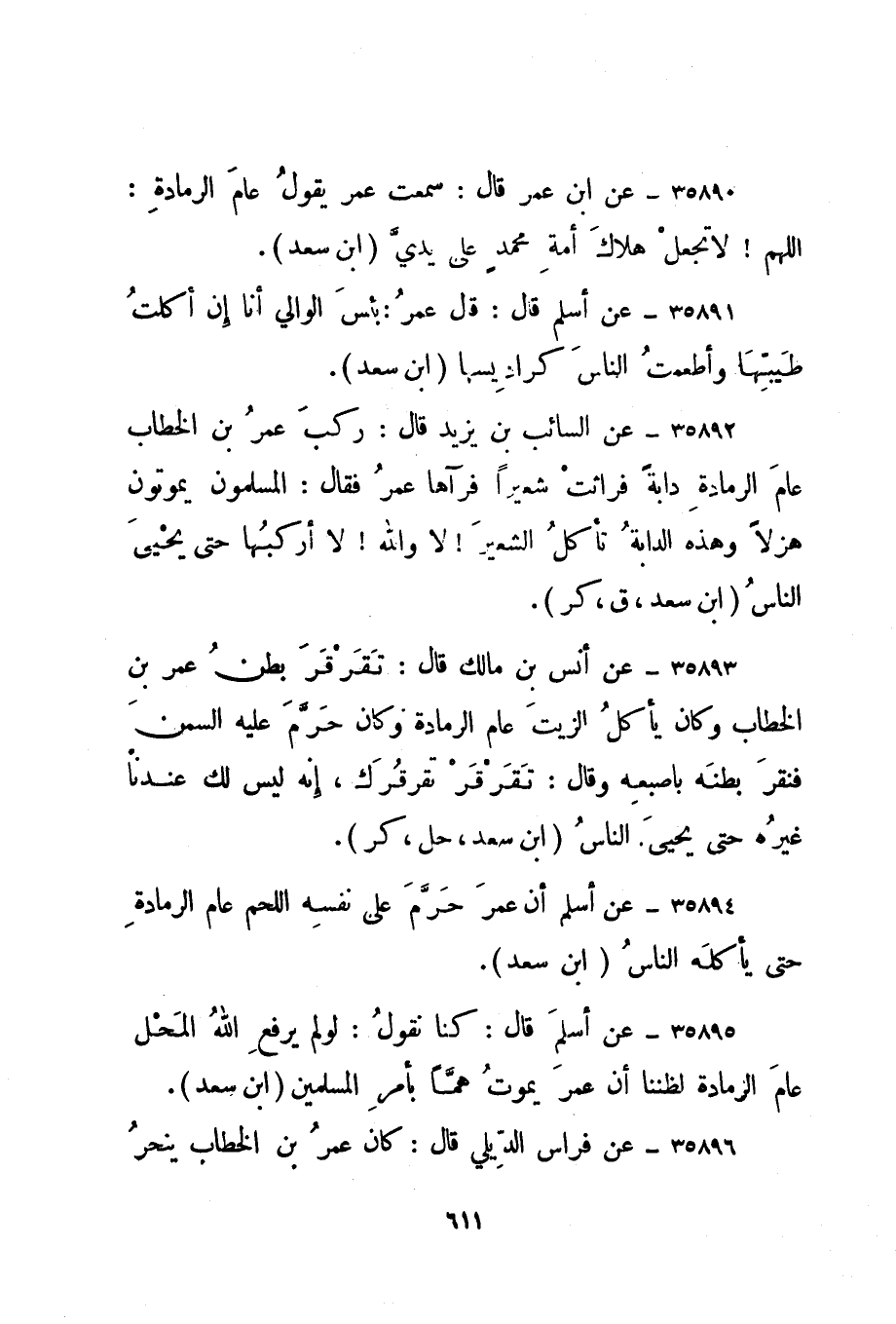 35890- عن ابن عمر قال: سمعت عمر يقول عام الرمادة: اللهم! لا تجعل هلاك أمة محمد على يدي. "ابن سعد".