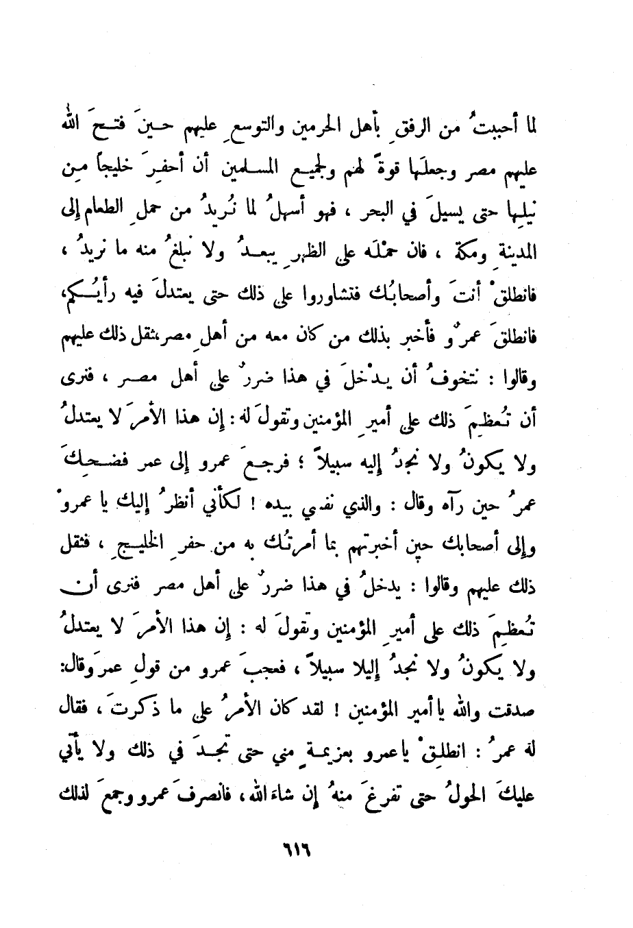 لما أحببت من الرفق بأهل الحرمين والتوسع عليهم حين فتح الله عليهم مصر وجعلها قوة لهم ولجميع المسلمين أن أحفر خليجا من نيلها حتى يسيل في البحر، فهو أسهل لما نريد من حمل الطعام إلى المدينة ومكة، فإن حمله على الظهر يبعد ولا نبلغ منه ما نريد، فانطلق أنت وأصحابك فتشاوروا على ذلك حتى يعتدل فيه رأيكم، فانطلق عمرو فأخبر بذلك من كان معه من أهل مصر، ثقل ذلك عليهم وقالوا: نتخوف أن يدخل في هذا ضرر على أهل مصر، فنرى أن تعظم ذلك على أمير المؤمنين وتقول له: إن هذا الأمر لا يعتدل ولا يكون ولا نجد إليه سبيلا، فرجع عمرو إلى عمر فضحك عمر حين رآه وقال: والذي نفسي بيده! لكأني أنظر إليك يا عمرو وإلى أصحابك حين أخبرتهم بما أمرتك به من حفر الخليج، فثقل ذلك عليهم وقالوا: يدخل في هذا ضرر على أهل مصر فنرى أن تعظم ذلك على أمير المؤمنين وتقول له: إن هذا الأمر لا يعتدل ولا يكون ولا نجد إليه سبيلا، فعجب عمرو من قول عمر وقال: صدقت والله يا أمير المؤمنين! لقد كان الأمر على ما ذكرت، فقال له عمر: انطلق يا عمرو بعزيمة مني حتى تجد في ذلك ولا يأتي عليك الحول حتى تفرغ منه إن شاء الله، فانصرف عمرو وجمع لذلك