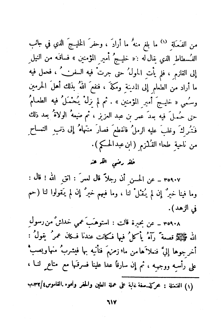 من الفعلة 1 ما بلغ منه ما أراد، وحفر الخليج الذي في جانب الفسطاط الذي يقال له: "خليج أمير المؤمنين" فساقه من النيل إلى القلزم، فلم يأت الحول حتى جرت فيه السفن، فحمل فيه ما أراد من الطعام إلى المدينة ومكة، فنفع الله بذلك أهل الحرمين وسمي "خليج أمير المؤمنين". ثم لم يزل يحمل فيه الطعام حتى حمل فيه بعد عمر بن عبد العزيز، ثم ضيعه الولاة بعد ذلك فترك وغلب عليه الرمل فانقطع فصار منتهاه إلى ذنب التمساح من ناحية طحاء القلزم. "ابن عبد الحكم".