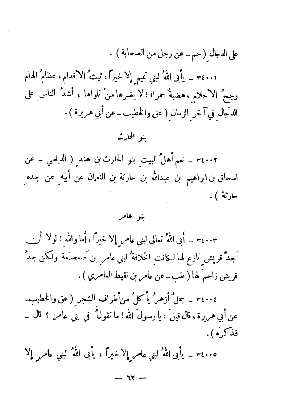 34001- "يأبى الله لبني تميم إلا خيرا، ثبت الأقدام، عظام الهام رجح الأحلام، هضبة حمراء؛ لا يضرها من ناواها، أشد الناس على الدجال في آخر الزمان. " عق والخطيب - عن أبي هريرة".