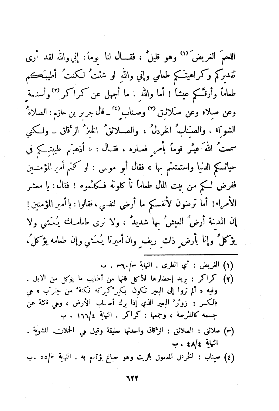 اللحم الغريض 1 وهو قليل، فقال لنا يوما: إني والله لقد أرى تقديركم وكراهيتكم طعامي وإني والله لو شئت لكنت أطيبكم طعاما وأرقكم عيشا! أما والله: ما أجهل عن كراكر 2 وأسنمة وعن صلاء وعن صلائق 3 وصناب 4 - قال جرير ابن حازم: الصلاة الشواء، والصناب الخردل، والصلائق الخبز الرقاق - ولكني سمعت الله عير قوما بأمر فعلوه، فقال: "أذهبتم طيبتكم في حياتكم الدنيا واستمعتم بها" فقال أبو موسى: لو كلمتم أمير المؤمنين ففرض لكم من بيت المال طعاما تأكلونه فكلموه! فقال: يا معشر الأمراء! أما ترضون لأنفسكم ما أرضى لنفسي، فقالوا: يا أمير المؤمنين! إن المدينة أرض العيش بها شديد، ولا نرى طعامك يعشي ولا يؤكل وإنا بأرض ذات ريف وإن أميرنا يعشي وإن طعامه يؤكل،
