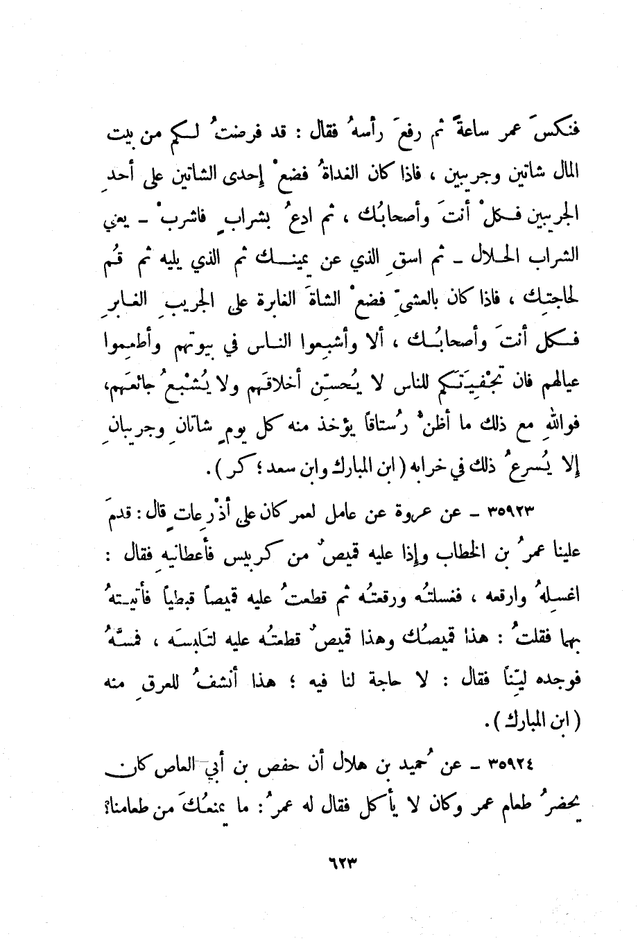 فنكس عمر ساعة ثم رفع رأسه فقال: قد فرضت لكم من بيت المال شاتين وجريبين، فإذا كان الغداة فضع إحدى الشاتين على أحد الجريبين فكل أنت وأصحابك، ثم ادع بشراب فاشرب - يعني الشراب الحلال - ثم اسق الذي عن يمينك ثم الذي يليه ثم قم لحاجتك، فإذا كان بالعشى فضع الشاة الغابرة على الجريب الغابر فكل أنت وأصحابك، ألا وأشبعوا الناس في بيوتهم وأطعموا عيالهم فإن تجفيتكم للناس لا يحسن أخلاقهم ولا يشبع جائعهم، فوالله مع ذلك ما أظن رستاقا يؤخذ منه كل يوم شاتان وجريبان إلا يسرع ذلك في خرابه. "ابن المبارك وابن سعد؛ كر".