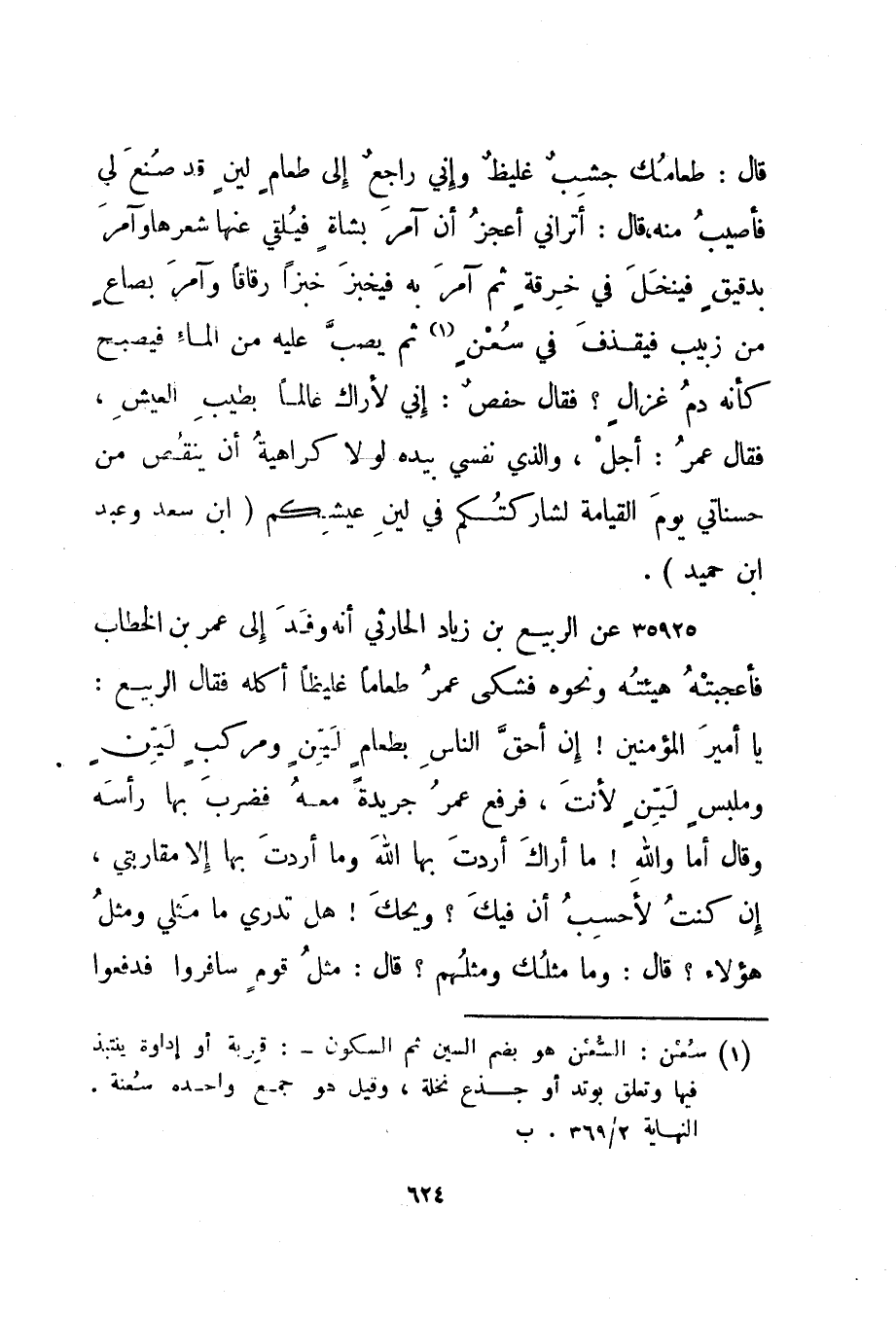 قال: طعامك جشب غليظ وإني راجع إلى طعام لين قد صنع لي فأصيب منه، قال: أتراني أعجز أن آمر بشاة فيلقي عنها شعرها وآمر بدقيق فينخل في خرقة ثم آمر به فيخبز خبزا رقاقا وآمر بصاع من زبيب فيقذف في سعن 1 ثم يصب عليه من الماء فيصبح كأنه دم غزال؟ فقال حفص: إني لأراك عالما بطيب العيش، فقال عمر: أجل، والذي نفسي بيده لولا كراهية أن ينقص من حسناتي يوم القيامة لشاركتكم في لين عيشكم. "ابن سعد وعبد ابن حميد".