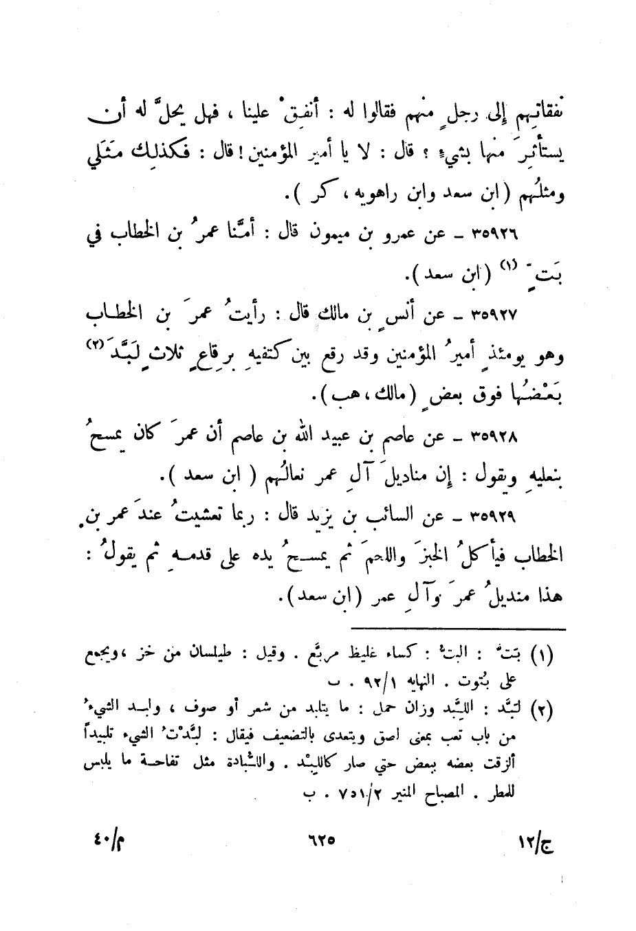 35928- عن عاصم بن عبيد الله بن عاصم أن عمر كان يمسح بنعليه ويقول: إن مناديل آل عمر نعالهم. "ابن سعد".