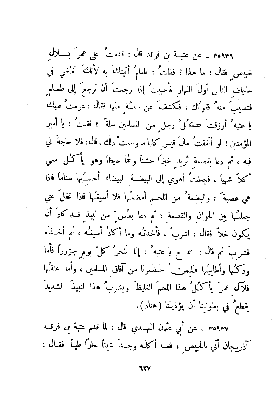 35936- عن عتبة بن فرقد قال: قدمت على عمر بسلال خبيص فقال: ما هذا؟ فقلت: طعام أتيتك به لأنك تقضي في حاجات الناس أول النهار فأحببت إذا رجعت أن ترجع إلى طعام فتصيب منه فقواك، فكشف عن سلة منها فقال: عزمت عليك يا عتبة أرزقت كل رجل من المسلمين سلة؟ فقلت: يا أمير المؤمنين! لو أنفقت مال قيس كلها ما وسعت ذلك، قال: فلا حاجة لي فيه، ثم دعا بقصعة ثريد خبزا خشنا ولحما غليظا وهو يأكل معي أكلا شهيا، فجعلت أهوي إلى البيضة البيضاء أحسبها سناما فإذا هي عصبة: والبضعة من اللحم أمضغها فلا أسيغها فإذا غفل عني جعلتها بين الخوان والقصعة؛ ثم دعا بعس من نبيذ قد كاد أن يكون خلا فقال: اشرب، فأخذته وما أكاد أسيغه، ثم أخذه فشرب ثم قال: اسمع يا عتبة: إنا ننحر كل يوم جزورا فأما ودكها وأطايبها فلمن حضرنا من آفاق المسلمين، وأما عنقها فلآل عمر يأكل هذا اللحم الغليظ ويشرب هذا النبيذ الشديد يقطع في بطوننا أن يؤذينا. "هناد".