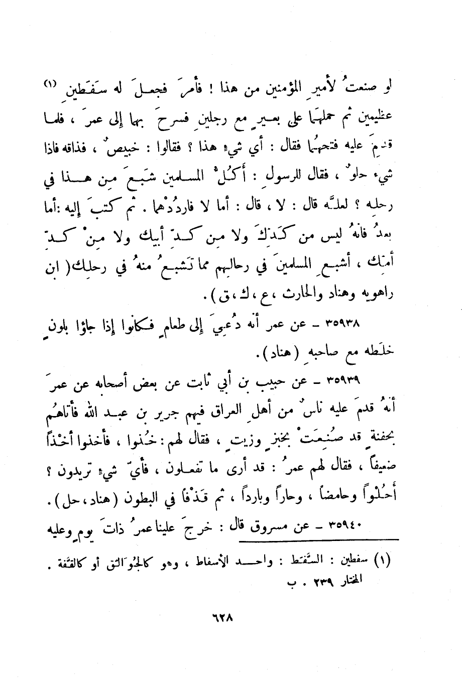 35939- عن حبيب بن أبي ثابت عن بعض أصحابه عن عمر أنه قدم عليه ناس من أهل العراق فيهم جرير بن عبد الله فأتاهم بحفنة قد صنعت بخبز وزيت، فقال لهم: خذوا، فأخذوا أخذا ضعيفا، فقال لهم عمر: قد أرى ما تفعلون، فأي شيء تريدون؟ أحلوا وحامضا، وحارا وباردا، ثم قذفا في البطون. "هناد، حل".