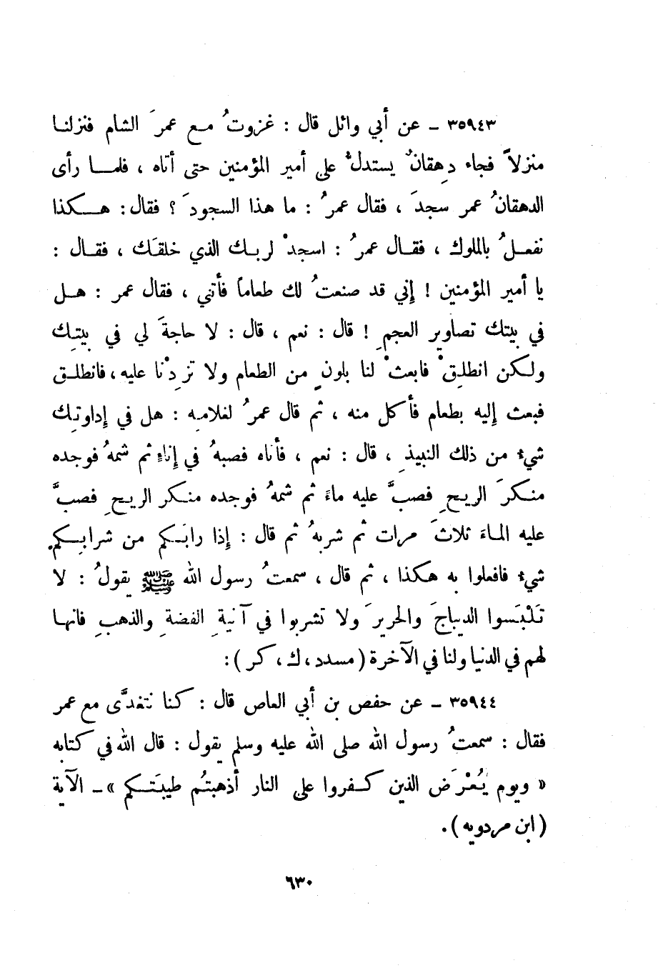 35943- عن أبي وائل قال: غزوت مع عمر الشام فنزلنا منزلا فجاء دهقان يستدل على أمير المؤمنين حتى أتاه، فلما رأى الدهقان عمر سجد، فقال عمر: ما هذا السجود؟ فقال: هكذا نفعل بالملوك، فقال عمر: اسجد لربك الذي خلقك، فقال: يا أمير المؤمنين! إني قد صنعت لك طعاما فأتني، فقال عمر: هل في بيتك تصاوير العجم! قال: نعم، قال: لا حاجة لي في بيتك ولكن انطلق فابعث لنا بلون من الطعام ولا تزدنا عليه، فانطلق فبعث إليه بطعام فأكل منه، ثم قال عمر لغلامه: هل في إداوتك شيء من ذلك النبيذ، قال: نعم، فأتاه فصبه في إناء ثم شمه فوجده منكر الريح فصب عليه ماء ثم شمه فوجده منكر الريح فصب عليه الماء ثلاث مرات ثم شربه ثم قال: إذا رابكم من شرابكم شيء فافعلوا به هكذا، ثم قال، سمعت رسول الله صلى الله عليه وسلم يقول: لا تلبسوا الديباج والحرير ولا تشربوا في آنية الفضة والذهب فإنها لهم في الدنيا ولنا في الآخرة. "مسدد، ك، كر".