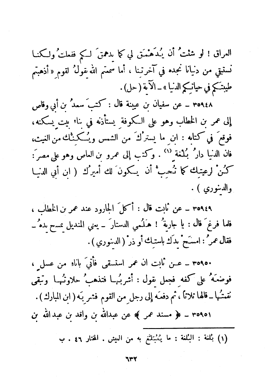 35948- عن سفيان بن عيينة قال: كتب سعد بن أبي وقاص إلى عمر بن الخطاب وهو على الكوفة يستأذنه في بناء بيت يسكنه، فوقع في كتابه: ابن ما يسترك من الشمس ويكنك من الغيث، فإن الدنيا دار بلغة 1. وكتب إلى عمرو بن العاص وهو على مصر: كن لرعيتك كما تحب أن يكون لك أميرك. "ابن أبي الدنيا والدينوري".