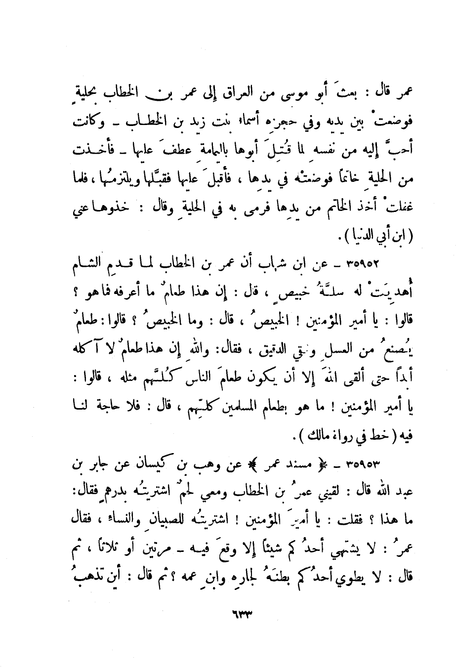35953- "مسند عمر" عن وهب بن كيسان عن جابر بن عبد الله قال: لقيني عمر بن الخطاب ومعي لحم اشتريته بدرهم فقال: ما هذا؟ فقلت: يا أمير المؤمنين! اشتريته للصبيان والنساء، فقال عمر: لا يشتهي أحدكم شيئا إلا وقع فيه - مرتين أو ثلاثا، ثم قال: لا يطوي أحدكم بطنه لجاره وابن عمه؟ ثم قال: أين تذهب