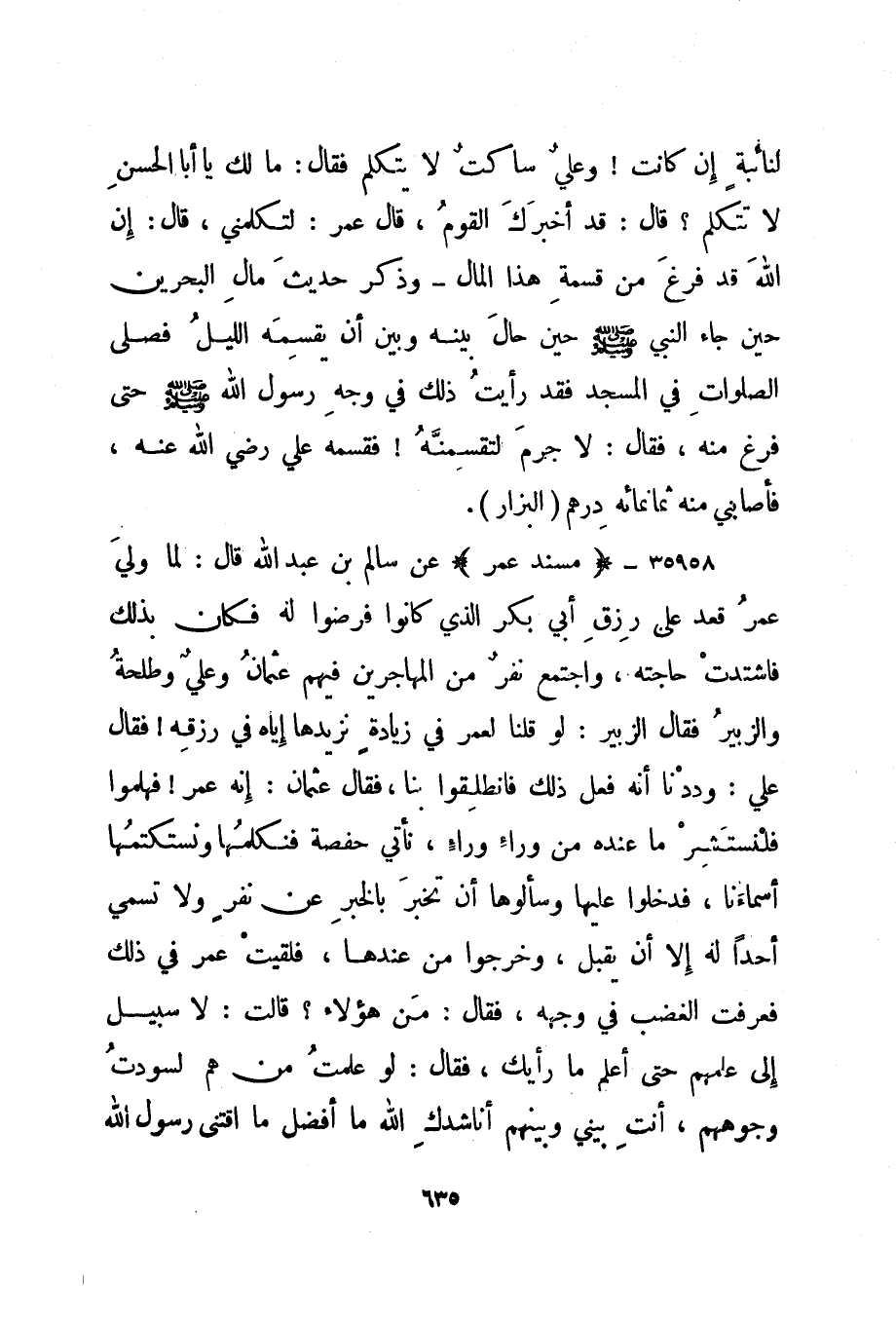 35958- "مسند عمر" عن سالم بن عبد الله قال: لما ولي عمر قعد على رزق أبي بكر الذي كانوا فرضوا له فكان بذلك فاشتدت حاجته، واجتمع نفر من المهاجرين فيهم عثمان وعلي وطلحة والزبير فقال الزبير: لو قلنا لعمر في زيادة نزيدها إياه في رزقه! فقال علي: وددنا أنه فعل ذلك فانطلقوا بنا، فقال عثمان: إنه عمر! فهلموا فلنستشر ما عنده من وراء وراء، نأتي حفصة فنكلمها ونستكتمها أسماءنا، فدخلوا عليها وسألوها أن تخبر بالخبر عن نفر ولا تسمي أحدا له إلا أن يقبل، وخرجوا من عندها، فلقيت عمر في ذلك فعرفت الغضب في وجهه، فقال: من هؤلاء؟ قالت: لا سبيل إلى علمهم حتى أعلم ما رأيك، فقال: لو علمت من هم لسودت وجوههم، أنت بيني وبينهم أناشدك الله ما أفضل ما اقتنى رسول الله