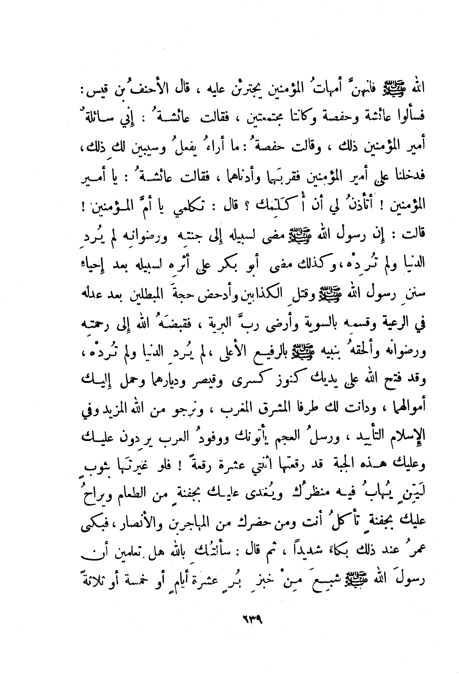 الله صلى الله عليه وسلم فإنهن أمهات المؤمنين يجترئن عليه، قال الأحنف بن قيس: فسألوا عائشة وحفصة وكانتا مجتمعتين، فقالت عائشة: إني سائلة أمير المؤمنين ذلك، وقالت حفصة: ما أراه يفعل وسيبين لك ذلك، فدخلنا على أمير المؤمنين فقربهما وأدناهما، فقالت عائشة: يا أمير المؤمنين! أتأذن لي أن أكلمك؟ قال: تكلمي يا أم المؤمنين! قالت: إن رسول الله صلى الله عليه وسلم مضى لسبيله إلى جنته ورضوانه لم يرد الدنيا ولم ترده، وكذلك مضى أبو بكر على أثره لسبيله بعد إحياء سنن رسول الله صلى الله عليه وسلم وقتل الكذابين وأدحض حجة المبطلين بعد عدله في الرعية وقسمه بالسوية وأرضى رب البرية، فقبضه الله إلى رحمته ورضوانه وألحقه بنبيه صلى الله عليه وسلم بالرفيع الأعلى، لم يرد الدنيا ولم ترده، وقد فتح الله على يديك كنوز كسرى وقيصر وديارهما وحمل إليك أموالهما، ودانت لك طرفا المشرق المغرب، ونرجو من الله المزيد وفي الإسلام التأييد، ورسل العجم يأتونك ووفود العرب يردون عليك وعليك هذه الجبة قد رقعتها اثنتي عشرة رقعة! فلو غيرتها بثوب لين يهاب فيه منظرك ويغدى عليك بجفنة من الطعام ويراح عليك بجفنة تأكل أنت ومن حضرك من المهاجرين والأنصار، فبكى عمر عند ذلك بكاء شديدا، ثم قال: سألتك بالله هل تعلمين أن رسول الله صلى الله عليه وسلم شبع من خبز بر عشرة أيام أو خمسة أو ثلاثة