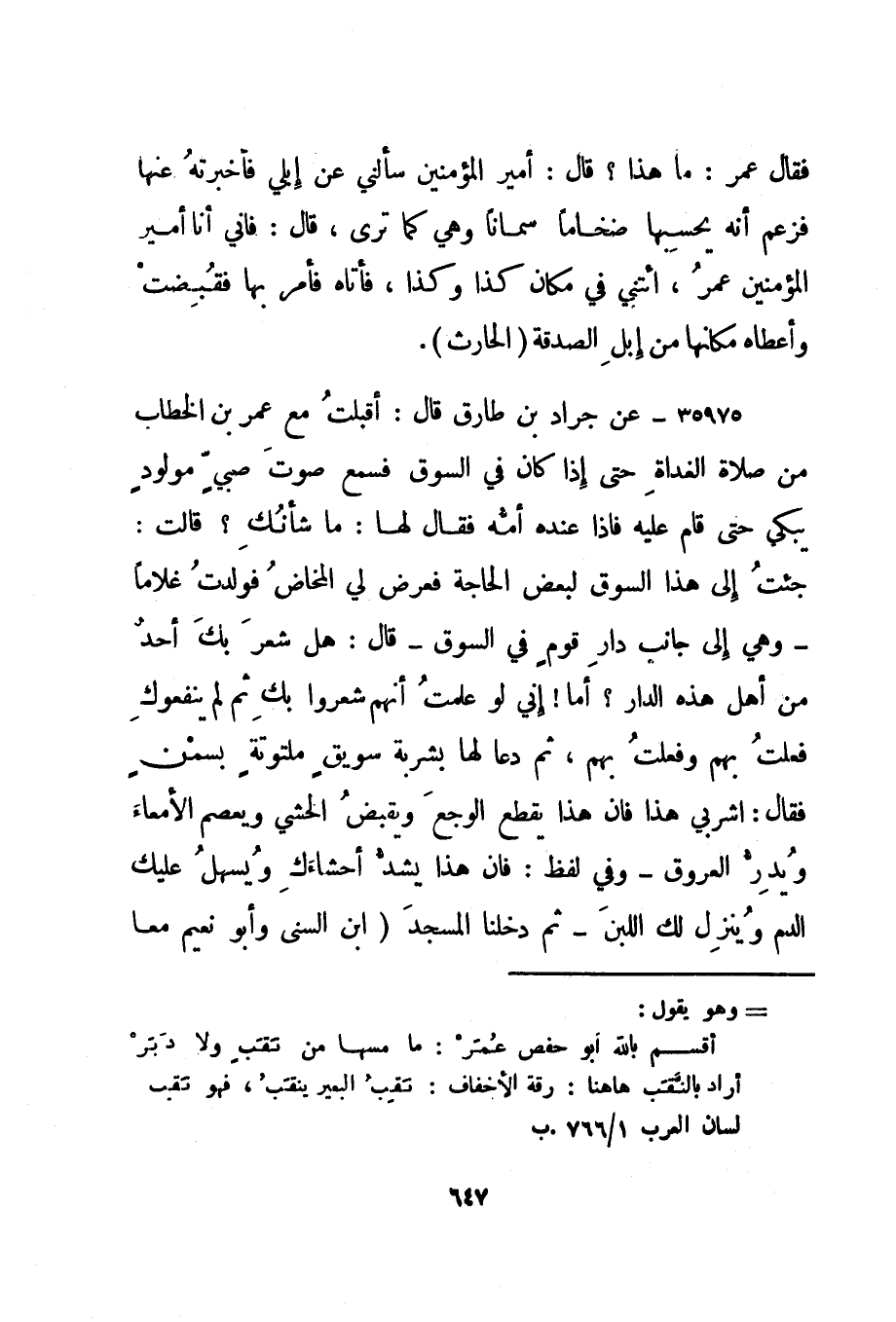 35975- عن جراد بن طارق قال: أقبلت مع عمر بن الخطاب من صلاة الغداة حتى إذا كان في السوق فسمع صوت صبي مولود يبكي حتى قام عليه فإذا عنده أمه فقال لها: ما شأنك؟ قالت: جئت إلى هذا السوق لبعض الحاجة فعرض لي المخاض فولدت غلاما - وهي إلى جانب دار قوم في السوق - قال: هل شعر بك أحد من أهل هذه الدار؟ أما! إني لو علمت أنهم شعروا بك ثم لم ينفعوك فعلت بهم وفعلت بهم، ثم دعا لها بشربة سويق ملتوتة بسمن فقال: اشربي هذا فإن هذا يقطع الوجع ويقبض الحشي ويعصم الأمعاء ويدر العروق - وفي لفظ: فإن هذا يشد أحشاءك ويسهل عليك الدم وينزل لك اللبن - ثم دخلنا المسجد. "ابن السني وأبو نعيم معا