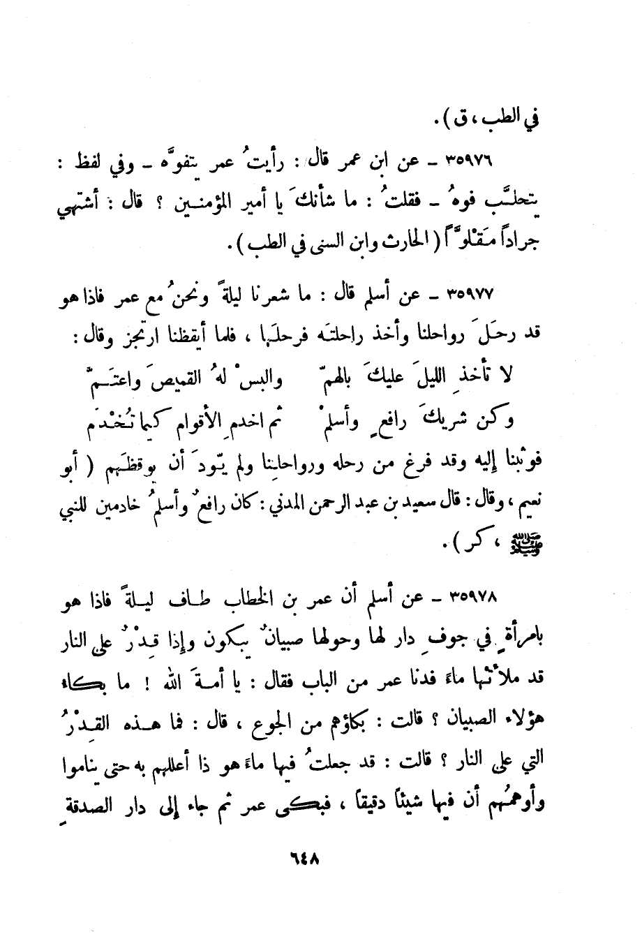 35977- عن أسلم قال: ما شعرنا ليلة ونحن مع عمر فإذا هو قد رحل رواحلنا وأخذ راحلته فرحلها، فلما أيقظنا ارتجز وقال: