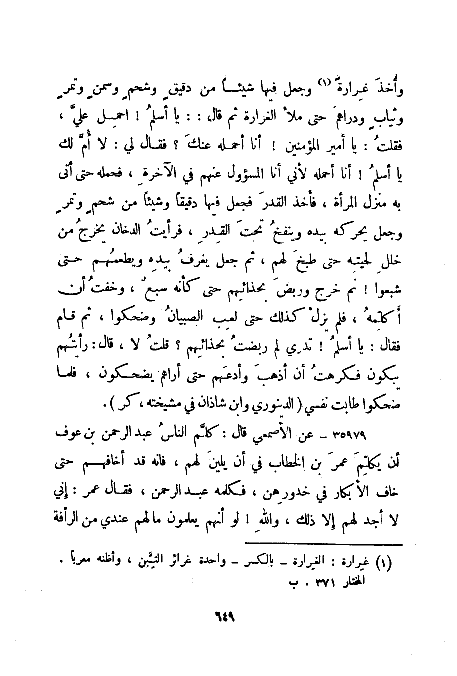 وأخذ غرارة 1 وجعل فيها شيئا من دقيق وشحم وسمن وتمر وثياب ودراهم حتى ملأ الغرارة ثم قال: يا أسلم! احمل علي، فقلت: يا أمير المؤمنين! أنا أحمله عنك؟ فقال لي: لا أم لك يا أسلم! أنا أحمله لأني أنا المسؤول عنهم في الآخرة، فحمله حتى أتى به منزل المرأة، فأخذ القدر فجعل فيها دقيقا وشيئا من شحم وتمر وجعل يحركه بيده وينفخ تحت القدر، فرأيت الدخان يخرج من خلل لحيته حتى طبخ لهم، ثم جعل يغرف بيده ويطعمهم حتى شبعوا! ثم خرج وربض بحذائهم حتى كأنه سبع، وخفت أن أكلمه، فلم يزل كذلك حتى لعب الصبيان وضحكوا، ثم قام فقال: يا أسلم! تدري لم ربضت بحذائهم؟ قلت لا، قال: رأيتهم يبكون فكرهت أن أذهب وأدعهم حتى أراهم يضحكون، فلما ضحكوا طابت نفسي. "الدينوري وابن شاذان في مشيخته، كر".