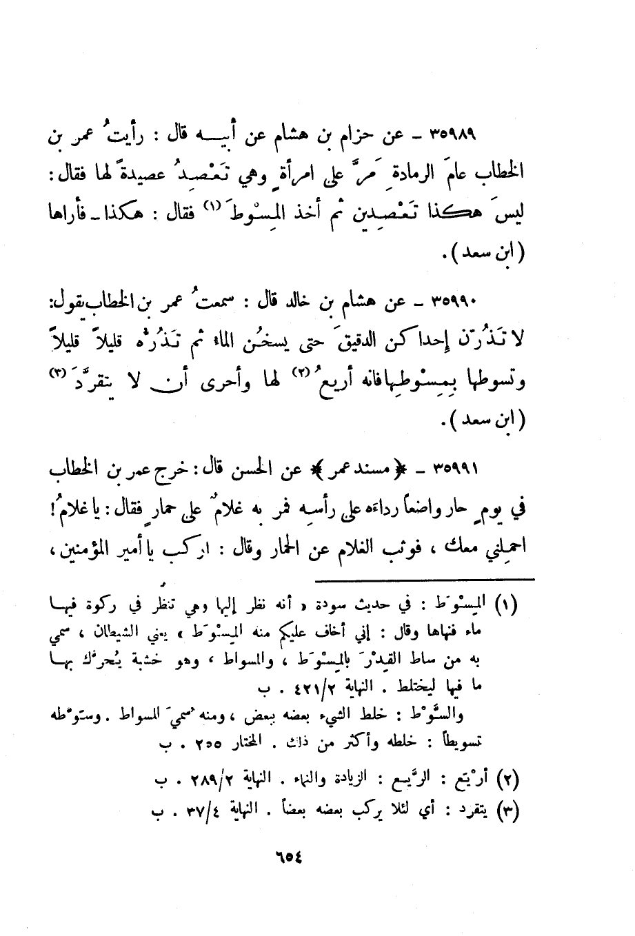 35989- عن حزام بن هشام عن أبيه قال: رأيت عمر بن الخطاب عام الرمادة مر على امرأة وهي تعصد عصيدة لها فقال: ليس هكذا تعصدين ثم أخذ المسوط 1 فقال: هكذا - فأراها. "ابن سعد".