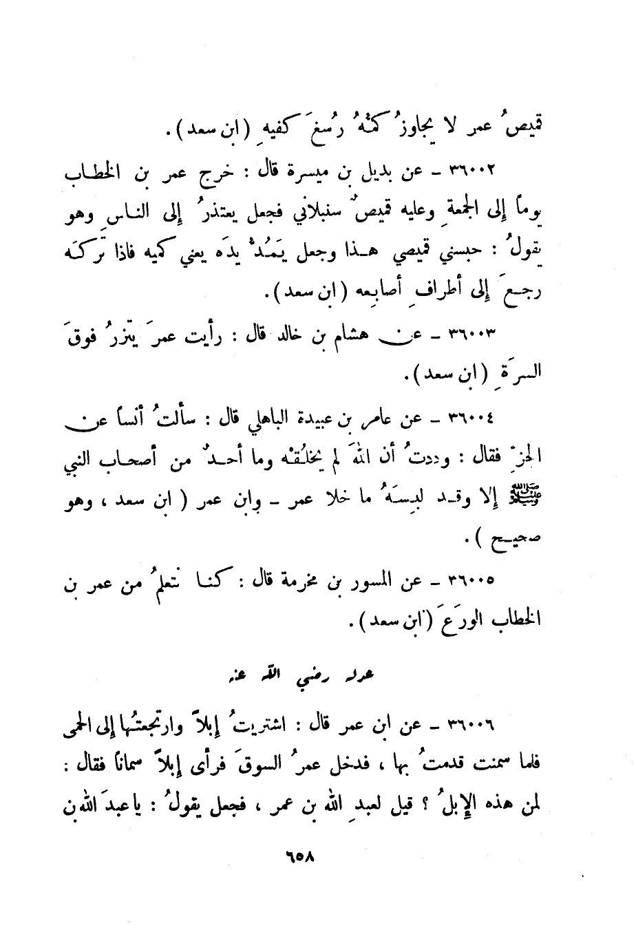 36002- عن بديل بن ميسرة قال: خرج عمر بن الخطاب يوما إلى الجمعة وعليه قميص سنبلاني فجعل يعتذر إلى الناس وهو يقول: حبسني قميصي هذا وجعل يمد يده يعني كميه فإذا تركه رجع إلى أطراف أصابعه. "ابن سعد".