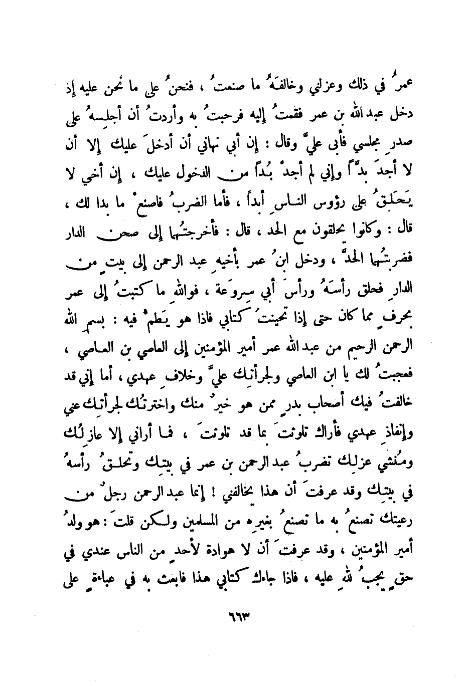 عمر في ذلك وعزلني وخالفه ما صنعت، فنحن على ما نحن عليه إذ دخل عبد الله بن عمر فقمت إليه فرحبت به وأردت أن أجلسه على صدر مجلسي فأبى علي وقال: إن أبي نهاني أن أدخل عليك إلا أن لا أجد بدا وإني لم أجد بدا من الدخول عليك، إن أخي لا يحلق على رؤوس الناس أبدا، فأما الضرب فاصنع ما بدا لك، قال: وكانوا يحلقون مع الحد، قال: فأخرجتهما إلى صحن الدار فضربتهما الحد، ودخل ابن عمر بأخيه عبد الرحمن إلى بيت من الدار فحلق رأسه ورأس أبي سروعة، فوالله ما كتبت إلى عمر بحرف مما كان حتى إذا تحينت كتابي فإذا هو يطم فيه: بسم الله الرحمن الرحيم من عبد الله عمر أمير المؤمنين إلى العاصي بن العاصي، فعجبت لك يا ابن العاصي ولجرأتك علي وخلاف عهدي، أما إني قد خالفت فيك أصحاب بدر ممن هو خير منك واخترتك لجرأتك عني وإنفاذ عهدي فأراك تلوثت بما قد تلوثت، فما أراني إلا عازلك ومنشي عزلك تضرب عبد الرحمن بن عمر في بيتك وتحلق رأسه في بيتك وقد عرفت أن هذا يخالفني! إنما عبد الرحمن رجل من رعيتك تصنع به ما تصنع بغيره من المسلمين ولكن قلت: هو ولد أمير المؤمنين، وقد عرفت أن لا هوادة لأحد من الناس عندي في حق يجب لله عليه، فإذا جاءك كتابي هذا فابعث به في عباءة على