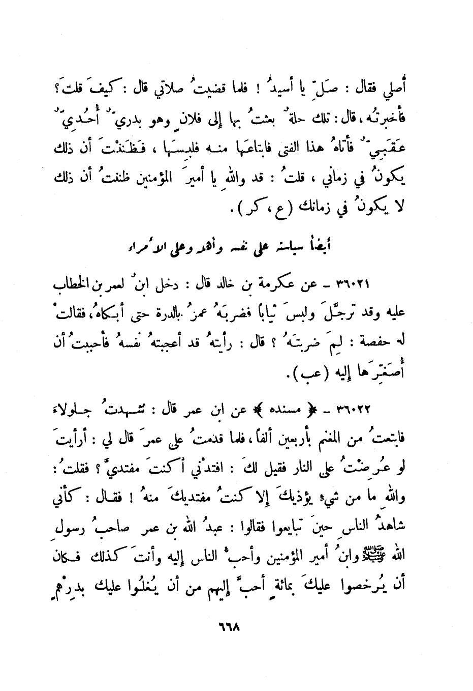 36021- عن عكرمة بن خالد قال: دخل ابن لعمر بن الخطاب عليه وقد ترجل ولبس ثيابا فضربه عمر بالدرة حتى أبكاه، فقالت له حفصة: لم ضربته؟ قال: رأيته قد أعجبته نفسه فأحببت أن أصغرها إليه. "عب".
