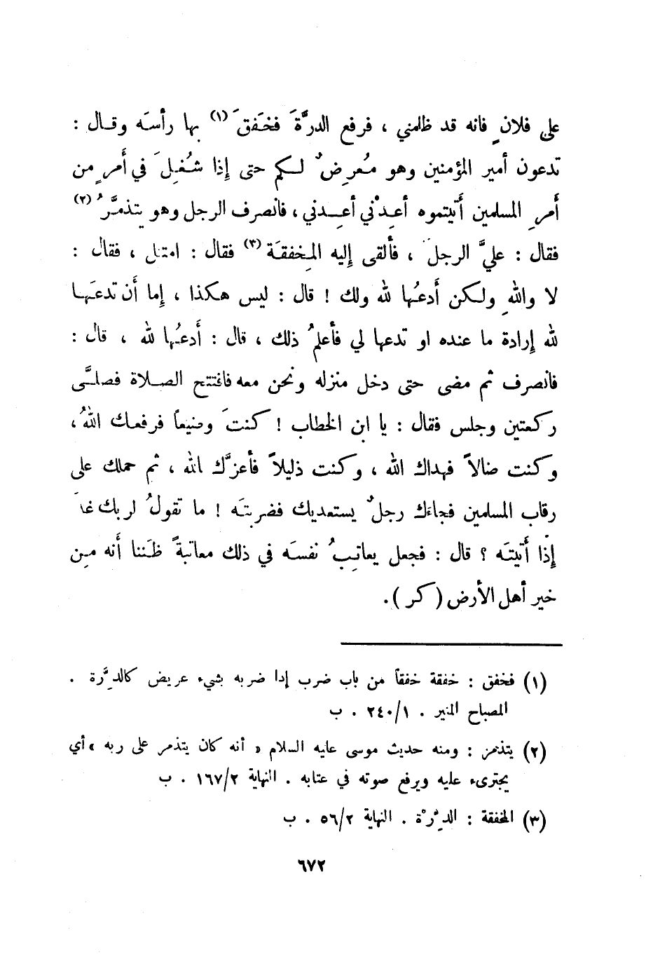 على فلان فإنه قد ظلمني، فرفع الدرة فخفق 1 بها رأسه وقال: تدعون أمير المؤمنين وهو معرض لكم حتى إذا شغل في أمر من أمر المسلمين أتيتموه أعدني أعدني، فانصرف الرجل وهو يتذمر 2 فقال: علي الرجل، فألقى إليه المخفقة 3 فقال: امتثل، فقال: لا والله ولكن أدعها لله ولك! قال: ليس هكذا، إما أن تدعها لله إرادة ما عنده أو تدعها لي فأعلم ذلك. قال: أدعها لله، قال: فانصرف ثم مضى حتى دخل منزله ونحن معه فافتتح الصلاة فصلى ركعتين وجلس فقال: يا ابن الخطاب! كنت وضيعا فرفعك الله، وكنت ضالا فهداك الله، وكنت ذليلا فأعزك الله، ثم حملك على رقاب المسلمين فجاءك رجل يستعديك فضربته! ما تقول لربك غدا إذا أتيته؟ قال: فجعل يعاتب نفسه في ذلك معاتبة ظننا أنه من خير أهل الأرض. "كر".