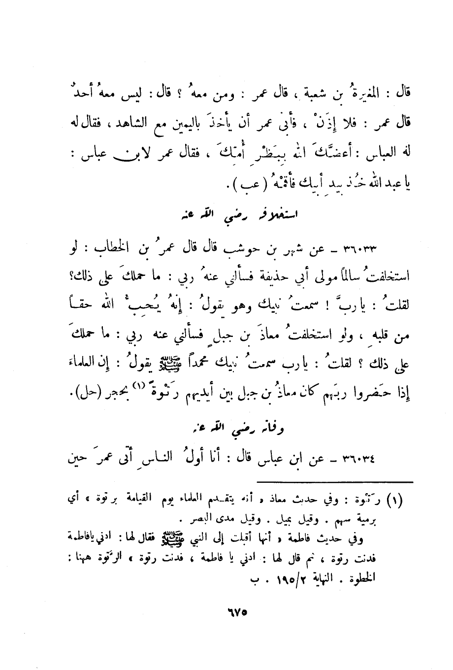36033- عن شهر بن حوشب قال قال عمر بن الخطاب: لو استخلفت سالما مولى أبي حذيفة فسألني عنه ربي: ما حملك على ذلك؟ لقلت: يا رب! سمعت نبيك وهو يقول: إنه يحب الله حقا من قلبه، ولو استخلفت معاذ بن جبل فسألني عنه ربي: ما حملك على ذلك؟ لقلت: يا رب سمعت نبيك محمدا صلى الله عليه وسلم يقول: إن العلماء إذا حضروا ربهم كان معاذ بن جبل بين أيديهم رتوة 1 بحجر. "حل".