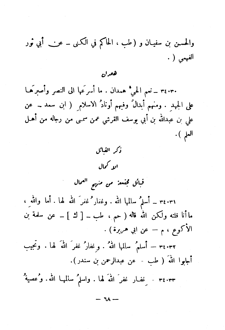 34030- "نعم الحي همدان، ما أسرعها إلى النصر وأصبرها على الجهد، ومنهم أبدال وفيهم أوتاد الإسلام. " ابن سعد - عن علي بن عبد الله بن أبي يوسف القرشي عمن سمى من رجاله من أهل العلم".