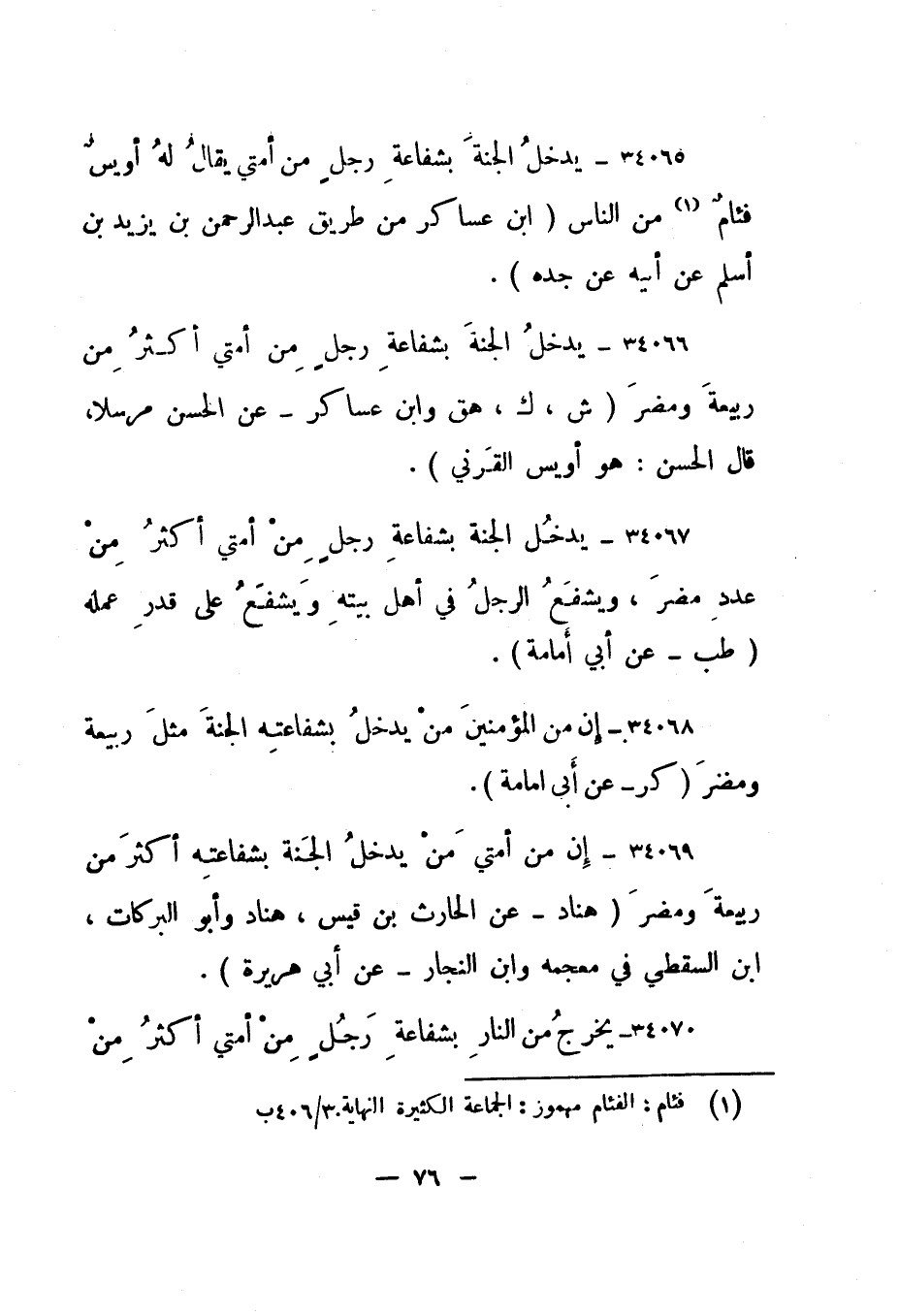 34065- "يدخل الجنة بشفاعة رجل من أمتي يقال له أويس فئام 1 من الناس. " ابن عساكر من طريق عبد الرحمن بن يزيد بن أسلم عن أبيه عن جده".