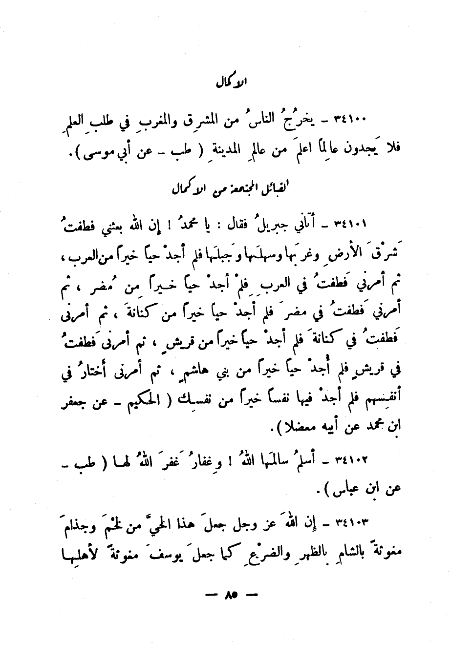 34100- "يخرج الناس من المشرق والمغرب في طلب العلم فلا يجدون عالما أعلم من عالم المدينة. " طب - عن أبي موسى".